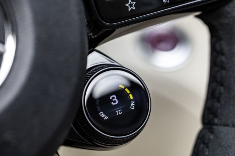 Innowacyjne, kolorowe przyciski wyświetlacza w V-kształtnej konsoli środkowej integrują wyświetlanie i kontrolowanie logiki przekładni, zawieszenia, ESP, układu wydechowego, profilu aerodynamicznego i funkcji start/stop. Dzięki technologii TFT przyciski wyświetlacza wykorzystują intuicyjnie zrozumiałe symbole do pokazywania funkcji i są łatwe w obsłudze i przy małym dotyku palca. Przyciski wyświetlacza uzupełnione są o dwa przyciski typu rocker do programów jazdy i regulacji głośności systemu audio.