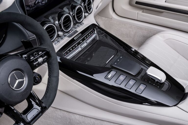 Standardowo AMG GT R Roadster wyposażono w elementy wykończenia z czarnego włókna węglowego/pianowego lakieru w tym Pakiet wykończenia Exclusive. Zakres obejmuje wkładkę konsoli środkowej i pierścienie wentylacji w czarnym lakierze. Wkładka w konsoli środkowej, wykończenie wokół czterech otworów wentylacyjnych na desce rozdzielczej i paski wykończeniowe w podłokietnikach w drzwiach wykonane są z wysokiej jakości włókna węglowego w wysokim połysku. Elementy wykończenia są także dostępne w czarnym matowym włóknie węglowym.