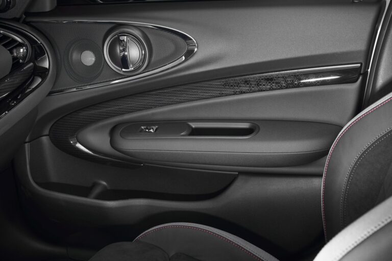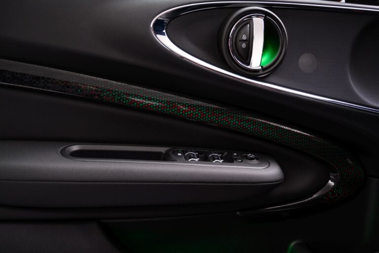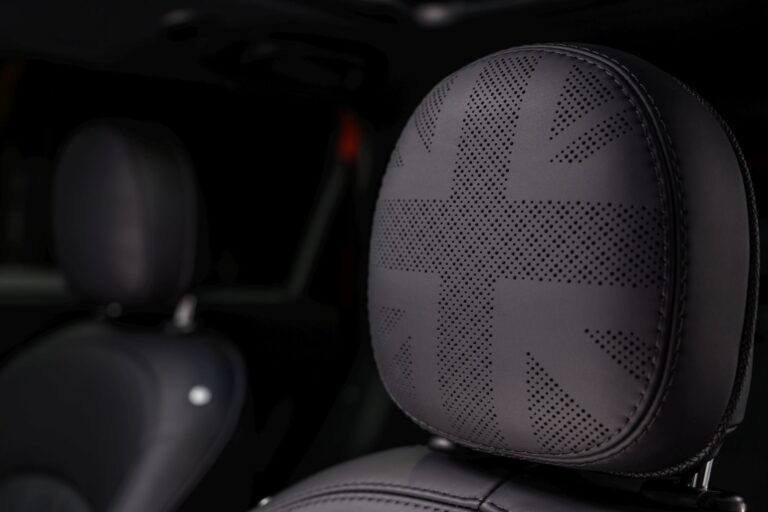 W ofercie znajduje się sportowa kierownica MINI Yours oraz wariant tapicerki siedzeń MINI Yours Leather Lounge Carbon Black. Siedzenia zyskują ekstrawagancki akcent dzięki motywowi Union Jack na zagłówkach, który jest stosowany z precyzyjnie umieszczonymi perforacjami. Szczególnie ekskluzywne akcenty zapewniają także opcje MINI Yours Interior Styles: dostępne są w trzech wersjach Piano Black illuminated, Frozen Blue illuminated oraz Fibre Alloy illuminated. W skład tych elementów wchodzą podświetlane obramowania drzwi oraz obramowanie kokpitu, wykończenia kokpitu i elementy wykończenia konsoli centralnej, które zaprojektowane są tak, aby harmonizować w dopasowanych kolorach. Wszystkie opcje MINI Yours są również dostępne indywidualnie. Pakiet MINI Yours obejmuje również dywaniki MINI Yours z czarnymi lamówkami i wzorem szwu w kolorze aluminium oraz etykietą projektową MINI Yours na bocznych oknach.