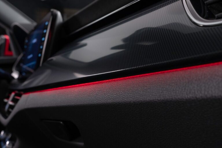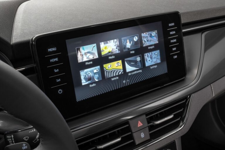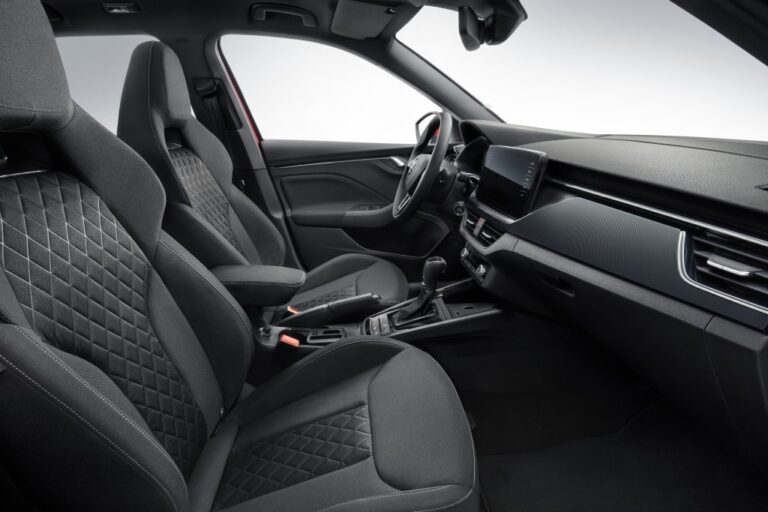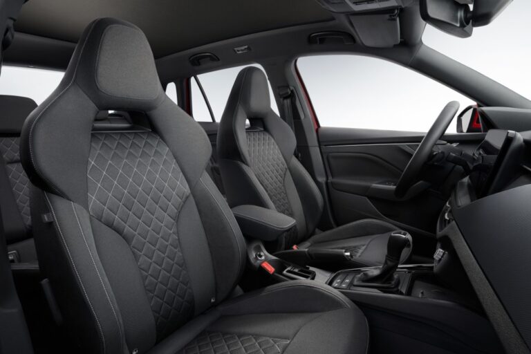 Solidny design kontynuuje się także we wnętrzu. Dzięki podwyższonej wyświetlacz infotainment w centralnej części deski rozdzielczej, kierowca może z łatwością i komfortem obsługiwać wiele funkcji pojazdu. Ozdobna listwa w kolorze chromu, biegnąca na całej szerokości deski rozdzielczej, stylowo łączy jej elementy. Jednym z efektywnych detali jest innowacyjne, kątowe umiejscowienie głośników. Dzięki ergonomicznemu projektowi, siedzenia kierowcy i pasażera z przodu oferują doskonały komfort i boczne wsparcie. Pokrowce na siedzenia mają wzór w kratę z efektem 3D, co dodatkowo podkreśla nowoczesny charakter wnętrza.