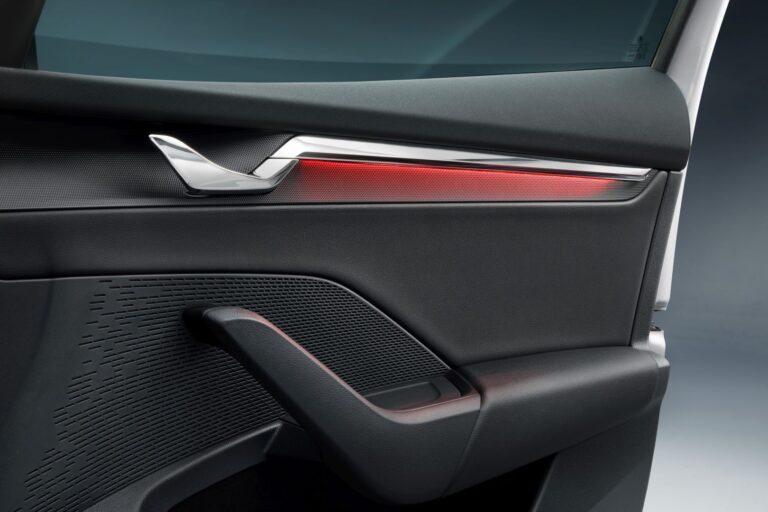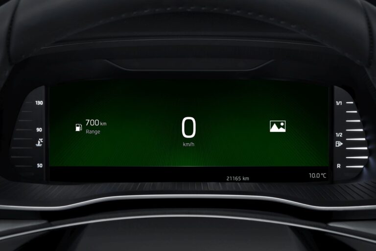 Kokpit jest modułowy i zorganizowany na różnych poziomach. Poniżej dużego i wolnostojącego centralnego wyświetlacza, obszar w kontrastowym kolorze odnosi się do linii grilla Škody. W dolnej części znajduje się nowa konsola centralna, która charakteryzuje się eleganckim i bardzo wyraźnym designem. Przyciski dotykowe do ważnych funkcji pojazdu, takich jak Wybór trybu jazdy czy Park Assist, zostały przeniesione wyżej poniżej centralnego wyświetlacza. Elementy chromowane zdobią konsolę centralną oraz wykończenia drzwi, które mają nowe klamki. Wykończenia przednich drzwi są teraz częściowo perforowane, a przycisk regulacji elektrycznie sterowanych luster jest teraz umieszczony na podłokietniku obok przycisków do elektrycznych okien. Zarówno drzwi, jak i kokpit wykonane są z nowych i miłych w dotyku materiałów, co tworzy szczególnie wysokiej jakości wygląd.