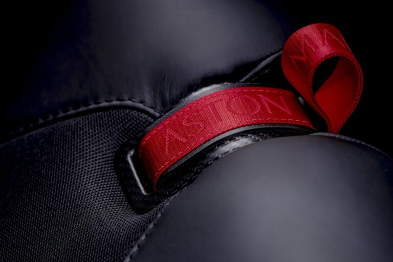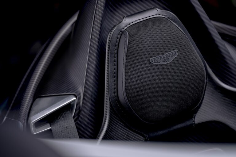 Specyfikacja wnętrza przekracza nowe granice, łącząc tradycyjne i nowoczesne materiały. Strukturalne satynowe włókno węglowe kontrastuje z tradycyjną, ręcznie wykonaną skórą Saddle, chromem, aluminium, a nawet drukowanym w 3D gumą. Wizualnie i fizycznie wnętrze zmniejsza masę, stwarzając smuklejszy i bardziej efektywny styl, ale zachowując wszystkie emocje i rzemiosło, za które Aston Martin jest znany. Przed pasażerem znajduje się wyjmowana skórzana torba zamiast tradycyjnej schowka, a pod tylnymi garbkami znajduje się dodatkowa przestrzeń na bagaż.
