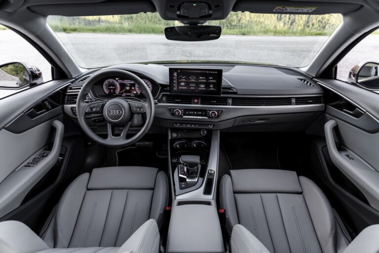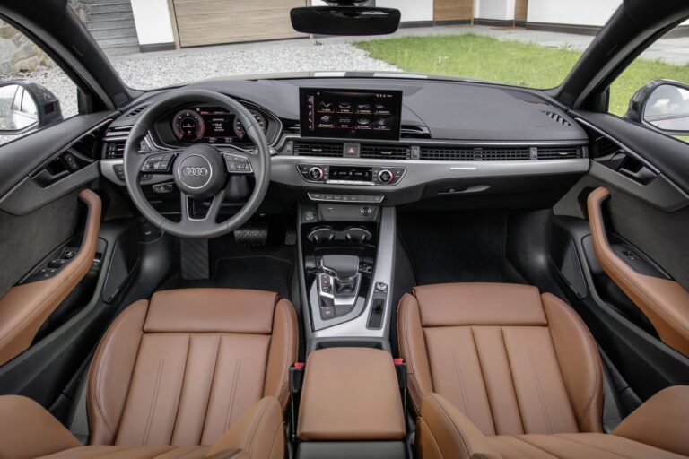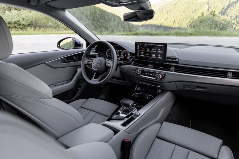 Wnętrze modeli Audi A4 wydaje się przestronne i hojnie łączy lekkość z nowoczesnymi funkcjami. Na szerokiej, asymetrycznej konsoli środkowej znajduje się schowek zajmujący miejsce po poprzednim terminalu sterowania MMI, z pokrętłem głośności po jego prawej stronie. Górne krawędzie deski rozdzielczej i wykończenia drzwi otaczają wnętrze jak opaska, nie pozostawiając kierowcy i pasażerom poczucia ciasnoty.
