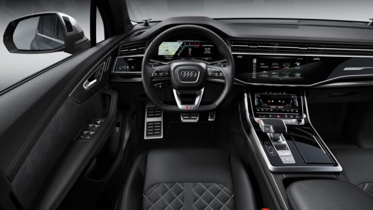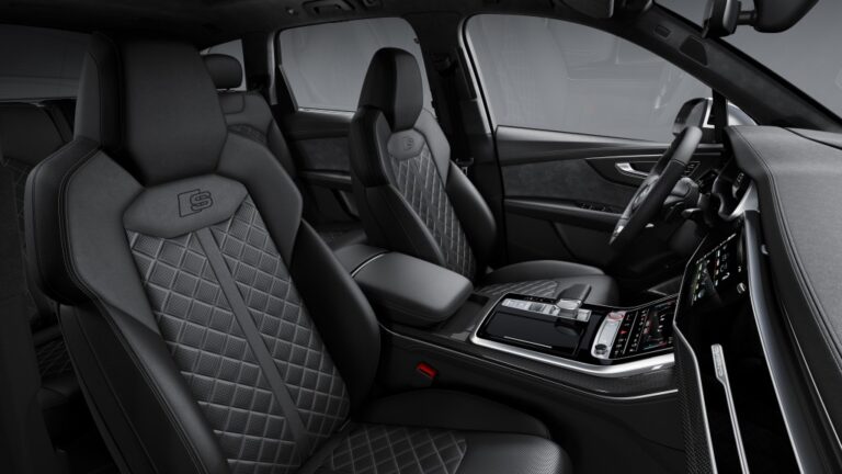 Audi SQ7 TDI wyróżnia się ciemnym wnętrzem ze skóry i Alcantary. Wstawki wykonane są z matowego, szczotkowanego aluminium lub opcjonalnie z włókna węglowego, co podkreśla sportowy charakter. Na życzenie dostępny jest pakiet oświetlenia konturowego/ambientalnego, który oświetla główne linie designu i powierzchnie w 30 regulowanych kolorach.