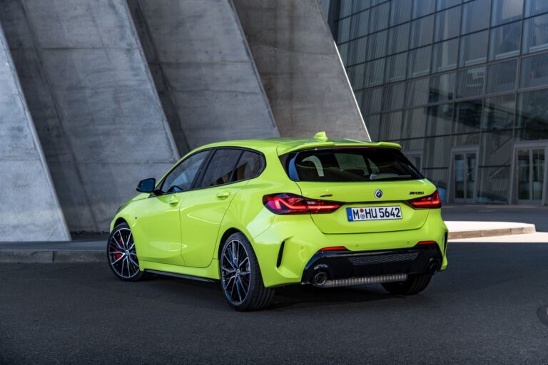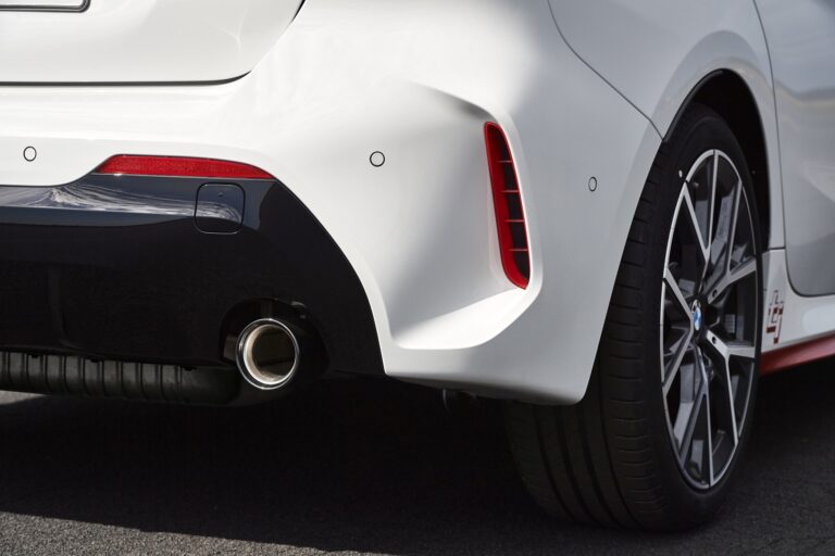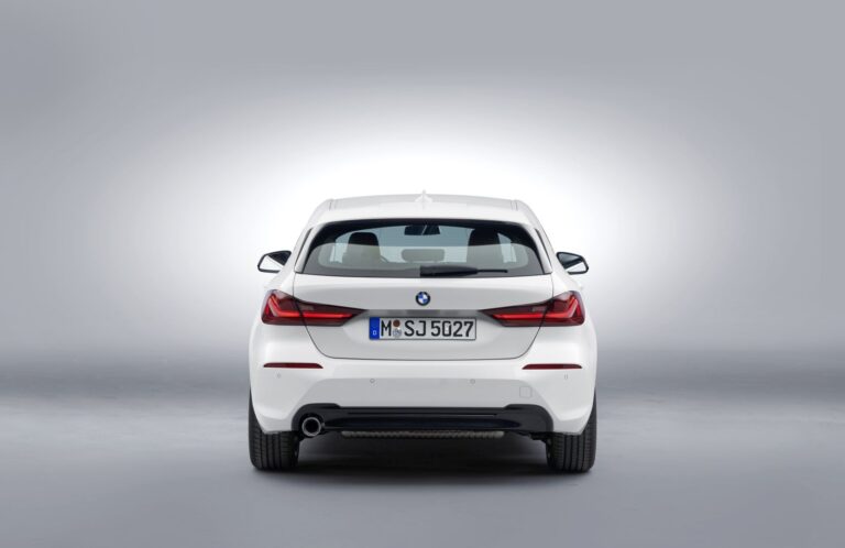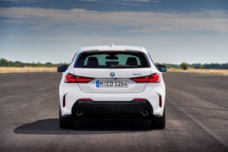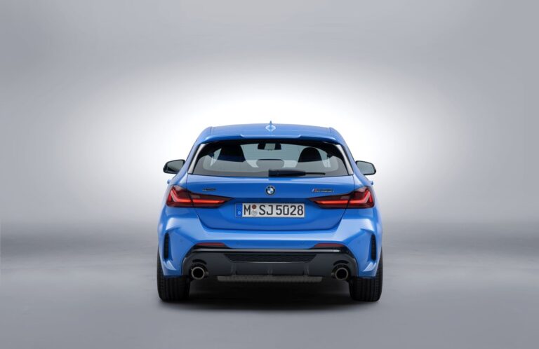 Pełne tylne światła LED, dostępne opcjonalnie, oferują całkowicie nową interpretację znanego kształtu „L”. Przyjmuje on formę jednego, smukłego elementu świetlnego z wyraźnym wzniesieniem po stronie. Ukryte wokół tego elementu pod czerwoną osłoną są kierunkowskazy, światła hamowania i tylne, światła przeciwmgłowe. W podstawowej wersji tylne światła przyjmują podobny wygląd z żarówkami. Wyraźnie ukształtowane powierzchnie i charakterystyczne końcówki wydechu w chromie o średnicy 90 milimetrów (100 mm i ścięte na BMW M135i xDrive) dopełniają sportowy obraz z tyłu.
