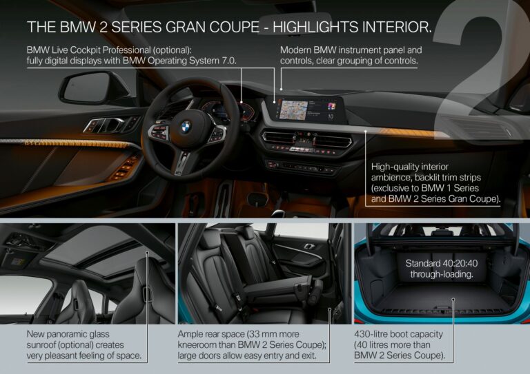 Wnętrze pierwszego w historii BMW 2-Series Gran Coupe łączy sportowy styl z wykwintnymi materiałami oraz przestrzenią zaprojektowaną z myślą o życiu rodzinnym i długich trasach. Innowacyjne rozwiązania szczegółowe, takie jak podświetlane listwy dekoracyjne, podkreślają nowoczesność czterodrzwiowego coupe, podczas gdy gra różnorodnych efektów wykończenia i tekstur za kierownicą, na desce rozdzielczej i drzwiach podkreśla wrażenie dynamizmu i jakości. Praktyczne miejsca do przechowywania dodatkowo zwiększają komfort i wygodę. Różne elementy sterujące są skierowane bezpośrednio do kierowcy, a ich grupowe rozmieszczenie ułatwia obsługę. Dostęp do opcjonalnych systemów infotainment dostarczanych przez nowy system operacyjny BMW 7.0 – z opcjonalnym sterowaniem gestami – odbywa się poprzez dużą grupę wyświetlaczy, których dwa duże ekrany mają przekątną do 10,25 cali (w przypadku BMW Live Cockpit Professional).