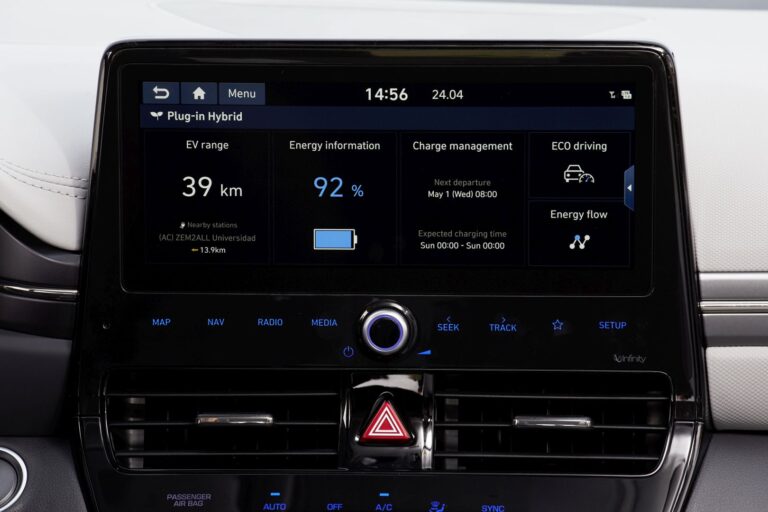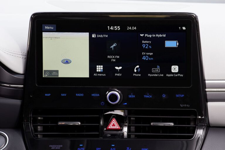 System Audio Video Navigation, który będzie dostępny w ofercie, wyświetla różnorodne informacje na swoim podzielonym ekranie dotykowym o przekątnej 10,25 cala i oferuje dostępne rozpoznawanie głosowe w chmurze w sześciu językach (z Blue Link). Ulepszony ekran można dostosować, oferując dwie wersje ekranu głównego, a także możliwość edytowania wyświetlanych widgetów i ikon. Oprócz standardowego Android Auto i Apple CarPlay, nawet w podstawowym systemie pokładowym, nowa funkcja Multi-Bluetooth (dostępna tylko w opcji AVN 10,25 cala) pozwala kierowcom nowego IONIQ jednocześnie połączyć dwie telefony, aby słuchać muzyki z każdego telefonu za pośrednictwem strumieniowania Bluetooth.
