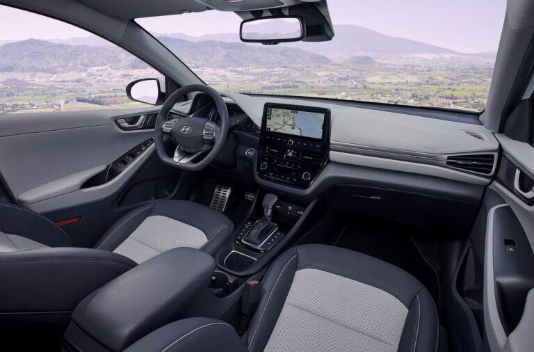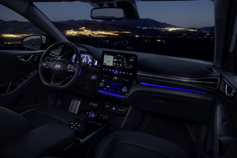 Pod nowym szerokim ekranem AVN 10,25 cala, panel sterowania ogrzewaniem i klimatyzacją został przeprojektowany i ma nowoczesne, błyszczące wykończenie. Nowe przyciski sterujące dotykowego typu umożliwiają intuicyjną obsługę ogrzewania, wentylacji i klimatyzacji. Standardowy wyświetlacz konsoli LCD o wysokiej rozdzielczości 7 cali w Hyundai IONIQ Electric (dostępny również w hybrydach i wersjach plug-in na wyższych wersjach wyposażeniowych) został ulepszony o podświetlenie, aby wizualizować różne motywy trybów jazdy. Aby dopełnić ulepszony nowoczesny design wnętrza, niebieskie podświetlenie zastosowano na dolnej desce rozdzielczej po stronie pasażera oraz na konsoli środkowej.
