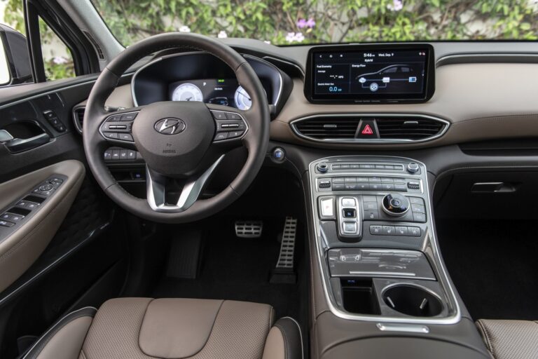 Nowe wnętrze Hyundai Santa Fe oferuje teraz więcej przestrzeni, komfortu i wygody w porównaniu do poprzedniego modelu. Podnosi to poziom luksusu dzięki każdemu elementowi wykończonemu w premium materiałach o miękkim dotyku. Posiada nowy projekt dolnego kokpitu, przeprojektowaną konsolę centralną oraz nowy 10,25-calowy ekran dotykowy AVN. Nowa unosząca się konsola centralna z przyciskami zmiany biegów jest połączona z podkładem w łagodnej krzywej. Po raz pierwszy nowy Santa Fe wyposażony jest w selektor trybu terenu: pokrętło sterujące umieszczone w konsoli centralnej, które umożliwia wygodne przełączanie między różnymi trybami jazdy.