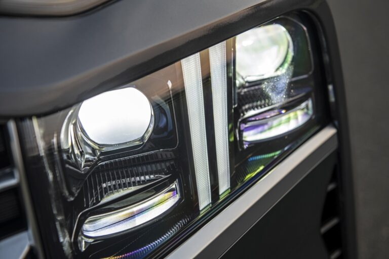 Na dolnej części zderzaka solidna osłona przeciwsłoneczna obejmuje dolny wlot powietrza, tworząc kształt zacisku i wizualnie wspierając główną architekturę grilla. Aby dopełnić potężną obecność przedniej części, rogi zdominowane są przez pionowo umieszczone wloty aerodynamiczne, które poprawiają efektywność przepływu powietrza i wzmacniają prostą oraz solidną sylwetkę.