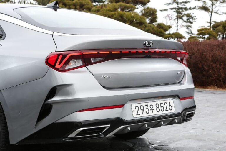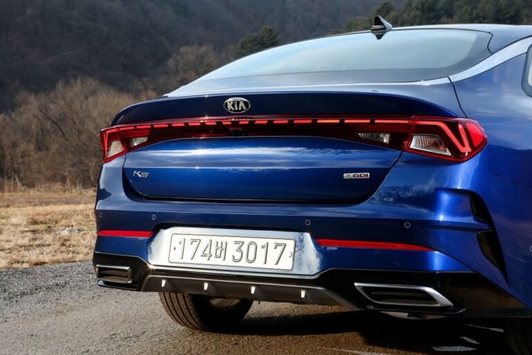 Tył K5, dopełniony tym akcentem chromowanym, szczyci się nową sygnaturą oświetleniową, której jednostki świetlne z poprzednika zostały zastąpione nowym LED-owym światłem dziennym, które rozciąga się na szerokość tylnej części bagażnika. Światła, które rozciągają się na klapie bagażnika, nawiązują do kształtu 'bicia serca’ przednich świateł, podczas gdy subtelny kształt ducktail na tylnej części bagażnika jest dopasowany do sportowego dolnego zderzaka oraz podwójnego designu tłumika w chromie.