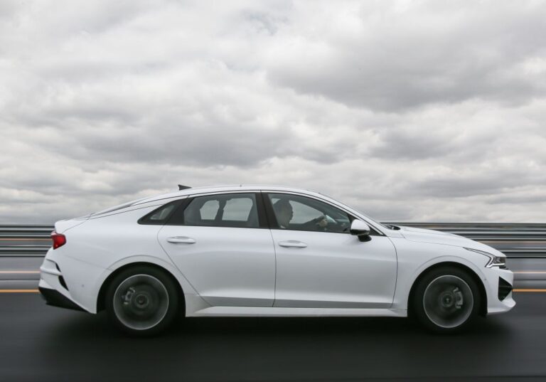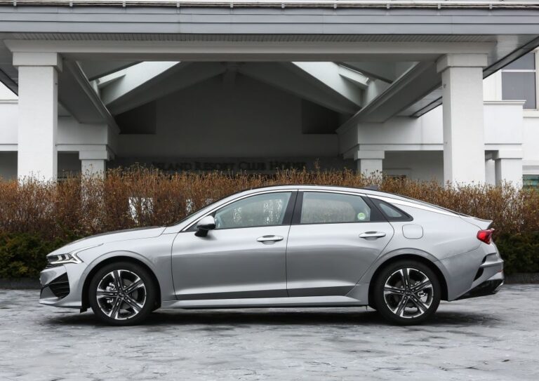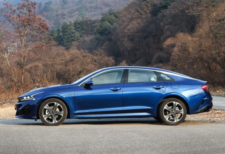 W profilu K5 ukazuje większy zarys muskularności, z nadwoziem lekko zwężającym się w połowie między nadkolami – inspirowanym kształtem butelki 'coke bottle’ nadwozia Stinger’a. Linia ramienia stopniowo wzrasta, zwężając przeszkloną część ku tyłowi, nadając pojazdowi sportową, 'pochyloną do przodu’ sylwetkę z boku. Proporcje K5 są kluczowe dla jej sportowego charakteru. Podczas gdy wysokość pojazdu została obniżona o 20 mm (do 1 445 mm), długość całkowita została wydłużona o 50 mm (do 4 905 mm), szerokość o 25 mm (do 1 860 mm), a rozstaw osi o 45 mm (do 2 850 mm). Dłuższa, niższa i szersza niż kiedykolwiek, K5 oferuje większą stabilność na drodze i maksymalne zaangażowanie kierowcy.