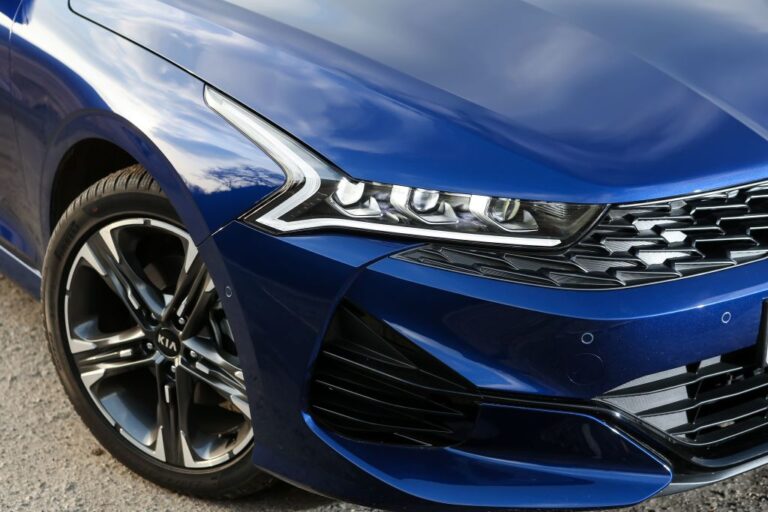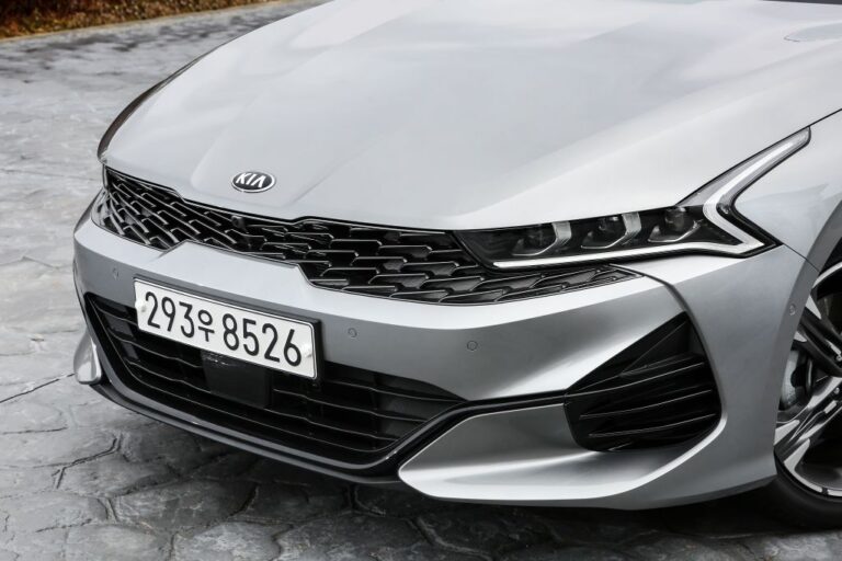 Przód samochodu charakteryzuje się ewolucją 'tiger nose’ Kia, z zintegrowanymi lampami LED w grillu oraz sygnaturą dziennych świateł w kształcie 'bicia serca’, wyrażającą emocje, które samochód ma wzbudzać. K5 ma bardziej agresywny przód, z grillem umieszczonym pod subtelnym przednim przodem maski, otoczonym kanciastymi kurtynami powietrznymi oraz szerszym wlotem powietrza w dolnej części zderzaka.