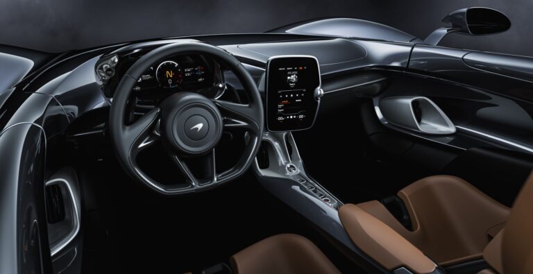 W pierwszym w McLarenie, kontrolki funkcji Active Dynamics są zintegrowane z zestawem wskaźników; umiejscowione po obu stronach nadwozia, przełączniki trybu dynamicznego znajdują się blisko łopatek zmiany biegów, a ich obsługa nie wymaga od kierowcy odrywania rąk od kierownicy. Dodatkowe funkcjonalności są dostępne za pośrednictwem centralnie umieszczonego 8-calowego monitora dotykowego o wysokiej rozdzielczości; centrum wszystkich funkcji pojazdu, ten nowy interfejs charakteryzuje się szklanym wyświetlaczem bez krawędzi i bocznym pokrętłem sterującym. Ten centralny ekran multimedialny został opracowany, aby umożliwić kierowcy jednoczesne uruchamianie wielu aplikacji, podobnie jak w smartfonie, przełączając między nimi na pionowym karuzelu. System pokazuje szereg aplikacji na ekranie, w tym nawigację satelitarną, telemetryczny system torowy McLaren, kamerę wsteczną oraz klimatyzację. Ekran zamontowany jest na lekkim ramieniu z włókna węglowego i pochylony w kierunku kierowcy.