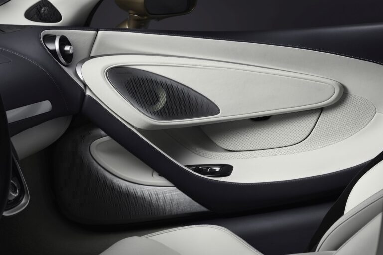 Technologia i nowoczesne rzemiosło mają w nowym McLarenie GT równorzędne znaczenie, gdzie najwyższej jakości materiały są uzupełnione takimi funkcjami jak najbardziej zaawansowany system infotainment McLarena do tej pory; ukryte oświetlenie ambientowe oraz możliwość zastosowania elektrochromowego panelu szklanego zamiast standardowego dachu z kompozytu włókna węglowego w kolorze czarnym, przyciemniającego lub rozjaśniającego się jednym dotykiem przycisku. Maszynowo obrabiane i żłobkowane przełączniki i elementy sterujące – w tym łopatki zmiany biegów zamontowane na kole kierownicy – kontrastują z błyszczącymi czarnymi obudowami dla ekranu infotainment, przycisków okien, konsoli wyboru biegów i osłon nawiewów. Dostępny jest również 12-głośnikowy, premium audio system Bowers & Wilkins z subwooferami z włókna węglowego i jednostkami mid-range wykonanymi z Kevlaru.