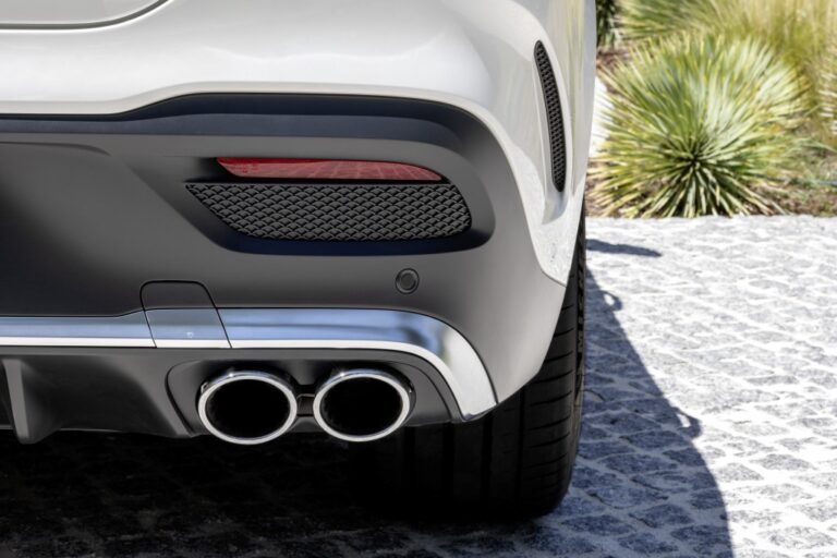 Nowo zaprojektowany tylny zderzak z detalami specyficznymi dla AMG, takimi jak wyrazisty dyfuzor i srebrna listwa wykończeniowa, wizualnie podkreśla szerokość pojazdu. Specjalny system wydechowy AMG z dwoma okrągłymi końcówkami rury w wysokim połysku zamyka sportowy, dominujący wygląd. Dodatkowe opcje indywidualizacji są dostępne w pakiecie AMG Night, który obejmuje szyby o wysokiej izolacyjności termicznej, ciemne okna oraz elementy wykończeniowe w czarnym kolorze.