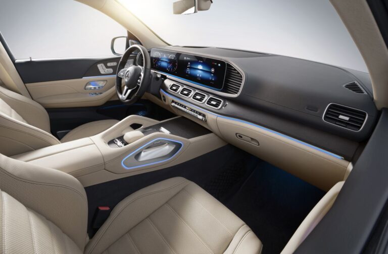 Wnętrze nowego GLS-a w całości opiera się na luksusowo eleganckiej estetyce, o czym świadczą natychmiast rozpoznawalne skórzane wykończenia, które są standardem. Łączą one komfort luksusowej limuzyny Mercedes-Benz z solidnie progresywnymi detalami SUV-a. Centralnym elementem w projekcie deski rozdzielczej jest imponujący ekran umieszczony w wyraźnym wsparciu deski rozdzielczej. Wsparcie deski rozdzielczej przechodzi w panelach drzwiowych, a integralny element wykończeniowy również sięga do drzwi.