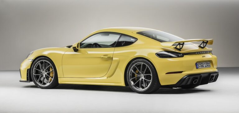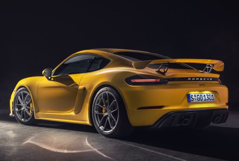 Z profilu, 20-calowe lekkie felgi połączone z obniżonym zawieszeniem sprawiły, że Porsche Cayman GT4 z 2020 roku wyglądał imponująco. Kilka detali wyróżniało go spośród reszty jego rodzeństwa. Osłony lusterek i wloty powietrza za drzwiami miały kolor nadwozia. Ponadto producent dodał wytłoczone litery GT4 na bocznych wlotach, które pomagały dostarczać powietrze do silnika. Jednak najbardziej rzucającą się w oczy aktualizacją wizualną nadwozia samochodu było masywne skrzydło zamontowane na klapie bagażnika. Było ono stałe, ale ręcznie regulowane. Poniżej, na czarnym wykończeniu, które wizualnie łączyło światła tylne, producent dodał napis Porsche w satynowym chromie oraz oznaczenie GT4 poniżej. Ostatecznie ta wersja miała unikalny układ wydechowy z dwoma rurami zainstalowanymi po bokach, w porównaniu do tych z zwykłego Caymana, które były zintegrowane z tylnym dyfuzorem.