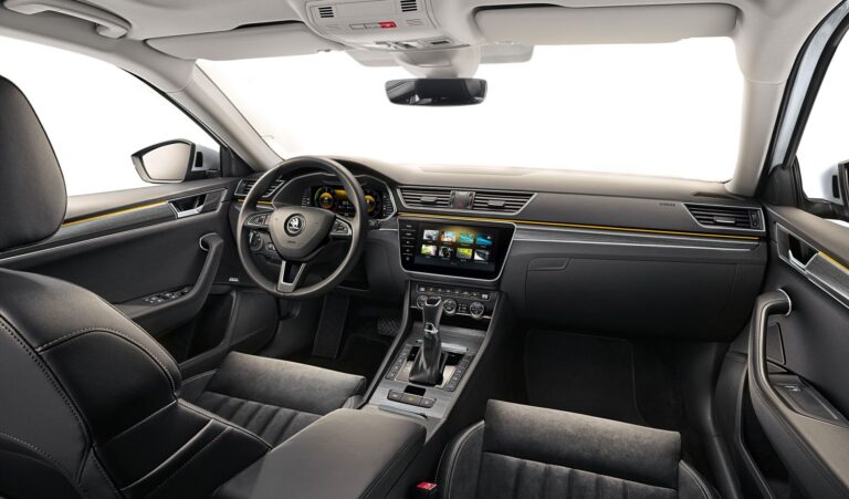 Wewnątrz, ŠKODA SUPERB SCOUT wita pasażerów specjalnymi, dekoracyjnymi listwami w efekcie drewna, które noszą logo SCOUT, podobnie jak przednie fotele. Pokrycia siedzeń wykonane są z materiału dedykowanego SCOUT z kontrastowymi przeszyciami. Opcjonalnie dostępne są fotele Alcantara®/skórzane z brązowym kontrastowym przeszyciem oraz, po raz pierwszy, nowe obszycia w kontrastowym kolorze na przodzie przednich foteli. Ogrzewane przednie fotele są standardem; istnieje również opcja ogrzewania zewnętrznych tylnych foteli. Centralny wyświetlacz wyposażony jest w dodatkowe ekrany off-road, a kierowca witany jest specjalnym logo powitalnym na wyświetlaczu przy wsiadaniu do samochodu.