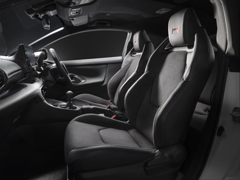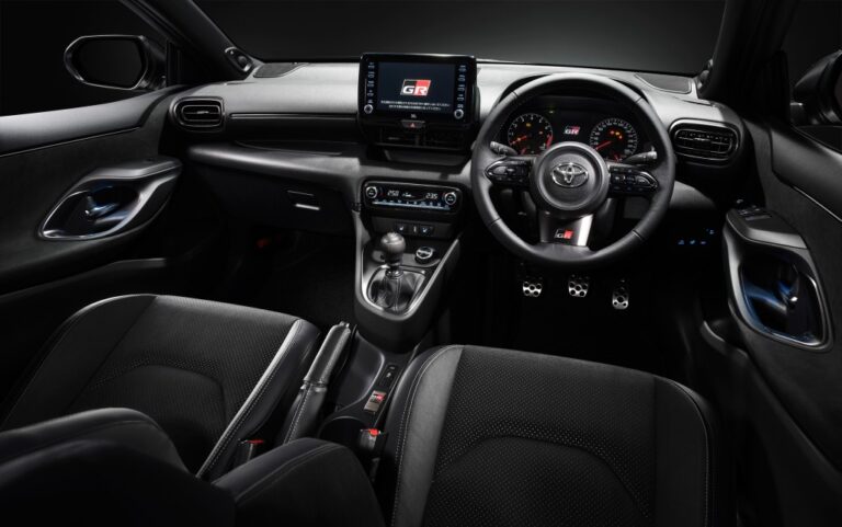 Wnętrze samochodu nie zachwycało luksusowymi materiałami. W drzwiach i innych miejscach dominował twardy plastik. Deska rozdzielcza wyglądała jakby pochodziła z regularnego Yaris, ale posiadała instrumenty specyficzne dla GR, w tym obrotomierz oznaczony do 8000 obrotów oraz prędkościomierz do 280 km/h (174 mph). Fotele ze wzmocnieniami i zintegrowanymi zagłówkami miały otwory na pięciopunktowe pasy, chociaż same nie były obecne w samochodzie. Z tyłu znajdowały się jedne z najbardziej ciasnych kanap w segmencie małych samochodów. Ta przestrzeń wydawała się bardziej odpowiednia do przewożenia kombinezonów wyścigowych i kasków. Jeśli chodzi o funkcjonalność, GR Yaris oferował system klimatyzacji, system infotainment oraz elektryczne szyby przednie.