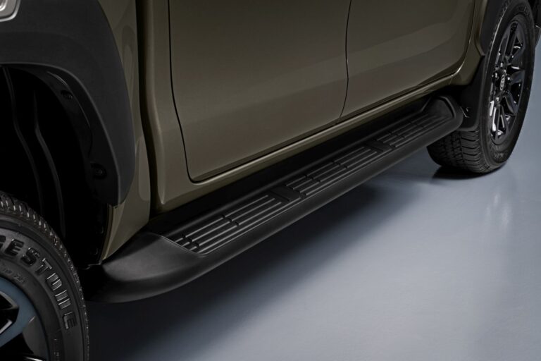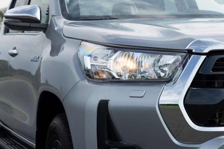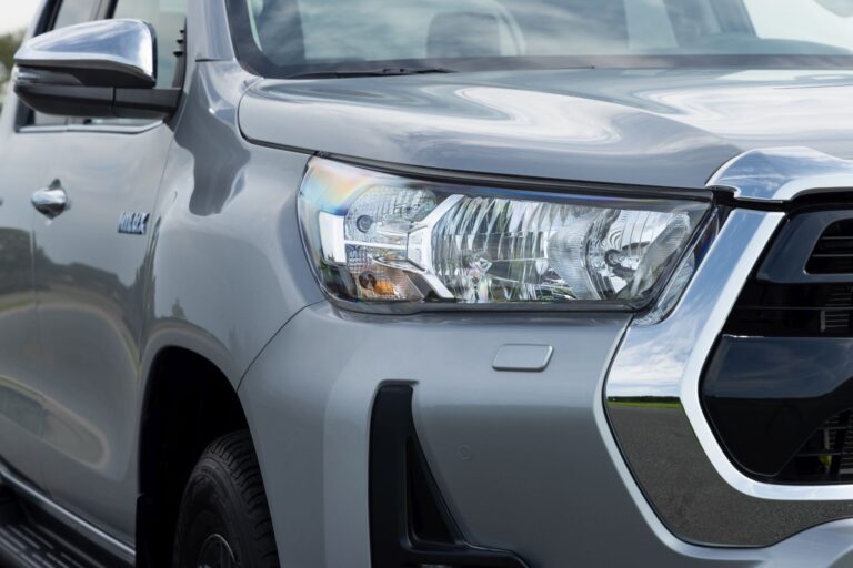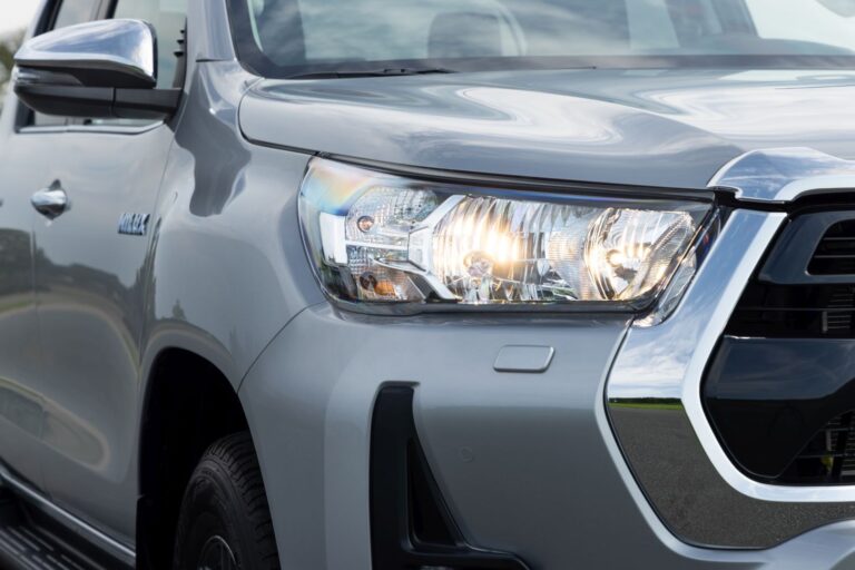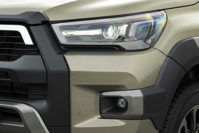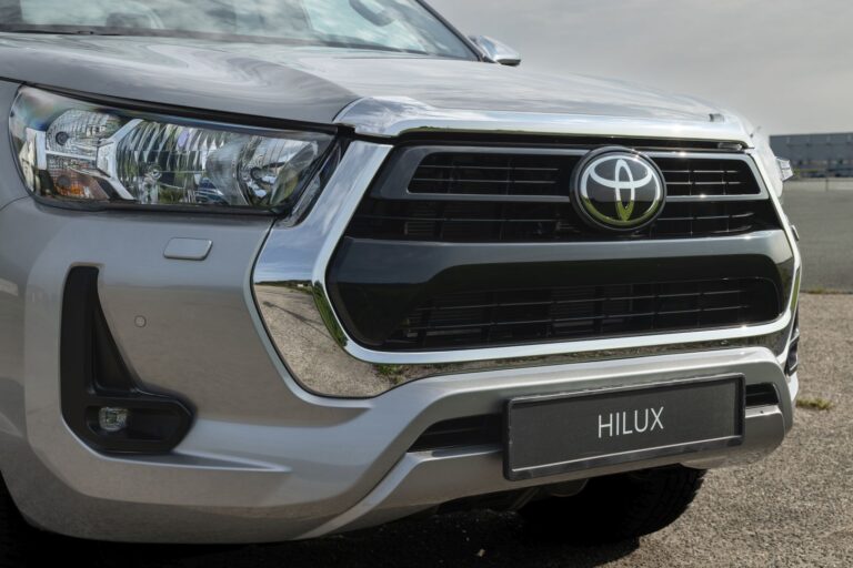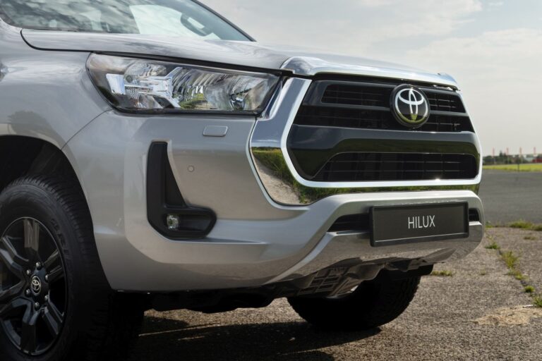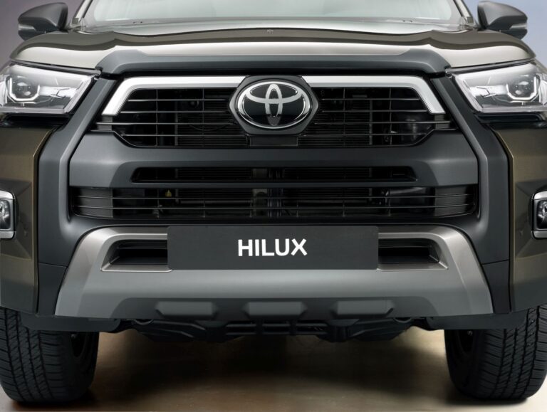 Przód nowej Toyoty Hilux został całkowicie przeprojektowany, z nową, odważną i mocną, trójwymiarową atrapą chłodnicy oraz zderzakiem, co znacznie zwiększa obecność tego pickup’a na drodze i podkreśla jego mocny charakter, jednocześnie wzmacniając jego twarde i robustne właściwości terenowe.