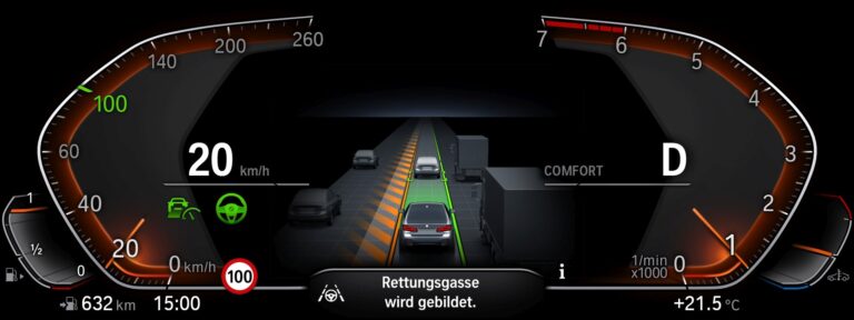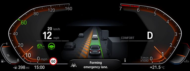 Potężny generator startowy 48V ma dodatkową zaletę, ponieważ umożliwia szybkie wyłączenie silnika i ponowne uruchomienie go przy minimalnych wibracjach. Skutkuje to poprawą komfortu podczas korzystania z funkcji Auto Start Stop i zwalniania. Kiedy kierowca hamuje podczas zbliżania się do skrzyżowania lub końca kolejki pojazdów, silnik może być wyłączany, gdy prędkość samochodu spadnie poniżej 15 km/h (9 mph). A jeśli funkcja zwalniania jest aktywowana, silnik jest całkowicie wyłączany, a nie tylko odłączany od napędu. Ta funkcja działa teraz przy prędkościach między 25 a 160 km/h (16 – 99 mph) i w nowym BMW 5-Series jest dostępna nie tylko w trybie ECO Pro, ale także w trybie COMFORT.