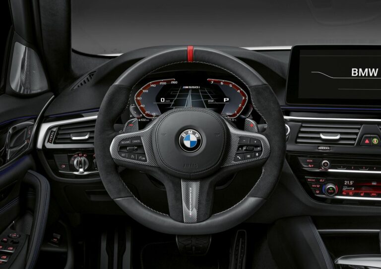 Wnętrze nowego BMW M550i xDrive Sedan ma ekskluzywne cechy wyposażenia ponad te w pakiecie M Sport, w tym oznaczenia modelu na przednich/tylnych listwach progowych oraz w wyświetlaczu zestawu wskaźników. Jak w modelu poprzednim, skórzana kierownica M jest standardowo wyposażona w łopatki zmiany biegów, umożliwiając kierowcom manualne przełączanie się między biegami ośmiobiegowej skrzyni Steptronic Sport.