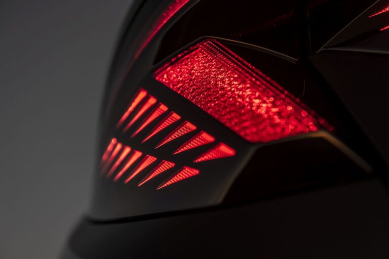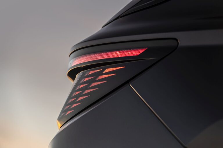 Kinetic design kontynuuje się na tyle, gdzie lampy tylne o pełnej szerokości zawierają częściowo ukryte trójkątne kształty, które są wyraźnie widoczne po włączeniu, nawiązując do tematu DRL z przodu. Aby osiągnąć czystość tego motywu projektowego, logo Hyundai jest podniesione i zintegrowane z szybą, a tylna wycieraczka jest ukryta pod tylnym spojlerem.