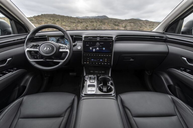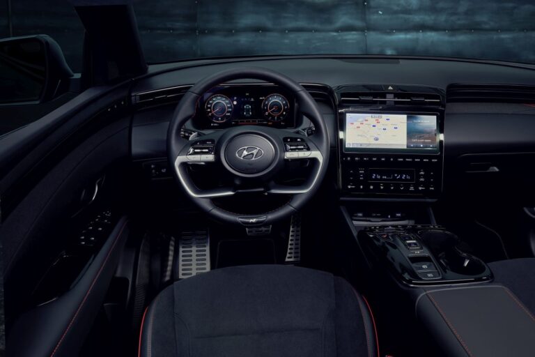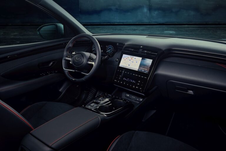 Wnętrze Tucson, zwane 'INTERSPACE’, oferuje zmysłowe, wielowarstwowe formy, które zapewniają uczucie otwartości i spokoju. To miejsce, w którym przestrzeń, technologia i informacje płynnie się ze sobą łączą. Szeroki grzbiet deski rozdzielczej płynnie łączy się z drzwiami, otaczając przednich pasażerów jak geologiczny kanion, podczas gdy pionowo zorientowana, w pełni zintegrowana centralna fasada opada na konsolę jak wodospad. Podwójne srebrne linie zdobnicze płynące od centralnej fasady do tylnych drzwi harmonizują estetycznie warstwy materiałów o neutralnych tonach. Oświetlenie nastrojowe można dostosować do 64 kolorów w dziesięciu poziomach jasności.