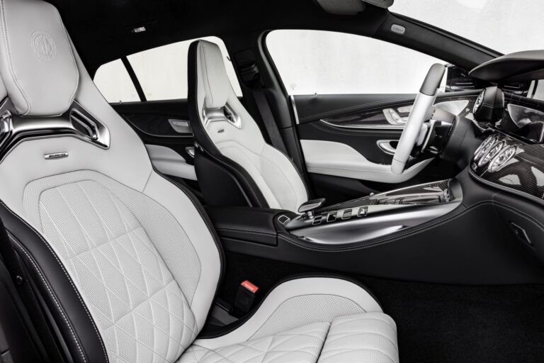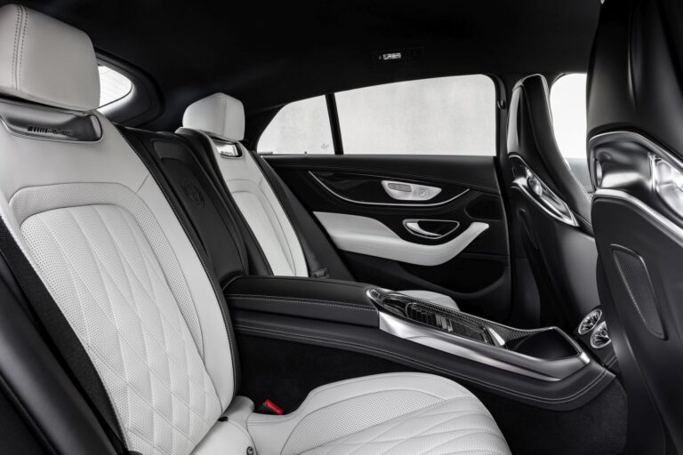 Aktualizacja wnętrza również koncentruje się na zapewnieniu jeszcze wyższego stopnia osobistego wyboru. Nowe kolory podkreślają sportowy lub luksusowy charakter AMG GT 4-Door Coupé – na przykład nowa kombinacja ekskluzywnej skóry nappa w kolorze perłowym szarym/titanowym z kontrastowymi szwami w kolorze żółtym lub finezyjna ekskluzywna skóra nappa w kolorze brązowym truflowym/czarnym w wykończeniu STYLE (diamentowe przeszycie). Oprócz popularnych dwu-tonowych siedzeń, pięć kolejnych kolorów w ekskluzywnej skórze nappa STYLE rozszerza ofertę wnętrza: brąz sienny, klasyc red, niebieski jachtowy, głęboki biały oraz szary neva. Siedzenia z przodu i z tyłu są całkowicie monochromatyczne w odpowiednim kolorze wykończenia, podobnie jak podłokietniki w drzwiach i obręcz kierownicy. Dywaniki podłogowe z wykończeniem w kolorze skóry oraz wyszywane logo AMG dopełniają staranny, ręcznie wykonany charakter.