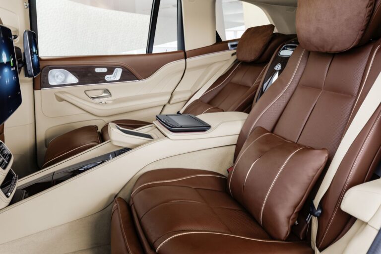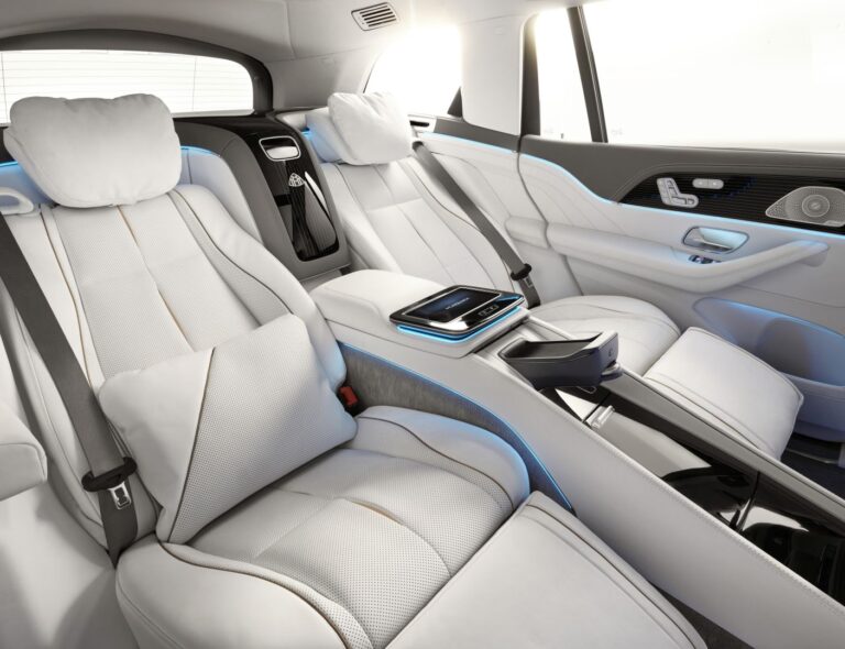 Standardowe wyposażenie Mercedes-Maybach GLS 600 4MATIC już teraz charakteryzuje się wyjątkowym luksusem. Dwa zewnętrzne tylne miejsca można elektronicznie przekształcić w fotele leżące. Wykończone w wysokiej jakości skórze Nappa, z różnorodnymi dodatkowymi poduszkami i skórzanymi wykończeniami wnętrza dostępnymi na życzenie. Elektroniczny panoramiczny dach przesuwno-uchylny z nieprzezroczystą roletą jest standardem, podobnie jak podgrzewane i wentylowane fotele z funkcją masażu. Na specjalne życzenie, stała konsola środkowa zmienia samochód w przestronny czteroosobowy pojazd, którego tył nadaje się zarówno do pracy, jak i relaksu. Konsola ta może być wyposażona w rozkładane, składane stoły oraz lodówkę pomieszczającą butelki szampana. Odpowiednie srebrne kieliszki do szampana są dostępne w ofercie akcesoriów.