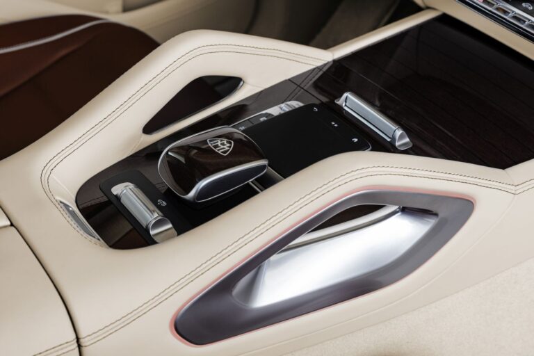 W czteroosobowej wersji, ciągła konsola środkowa ma zamykaną pokrywę, której dekor z drewna nawiązuje do dekoru wodospadu podziału bagażnika. Za nią znajduje się schowek lub, jeśli woli, duża, chłodzona komora, która może pomieścić na przykład trzy butelki szampana o pojemności 0,75 litra. Poniżej zamknięcia zamykanego znajduje się podgrzewany podłokietnik w skórze Nappa. Z przodu znajduje się MBUX Rear Tablet z 7-calowym ekranem do sterowania wszystkimi funkcjami komfortowymi. MBUX Rear Tablet można wyjąć z jego ładowarki/uchwytu dla wygody użytkowania. Uchwyt znajduje się w składanej pokrywie oświetlonego schowka, który jest również wyposażony w gniazdko 115V. Z przodu znajduje się miejsce na opcjonalny interfejs mobilny bezprzewodowy, który można dodatkowo wyposażyć w odbiornik Bluetooth do dyskretnej komunikacji.