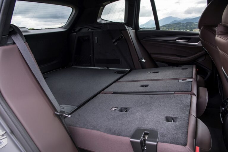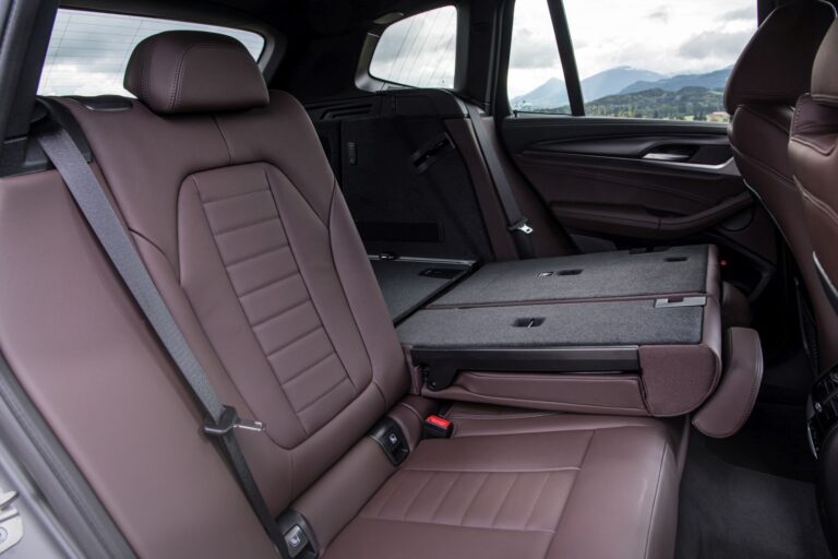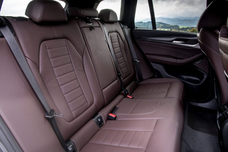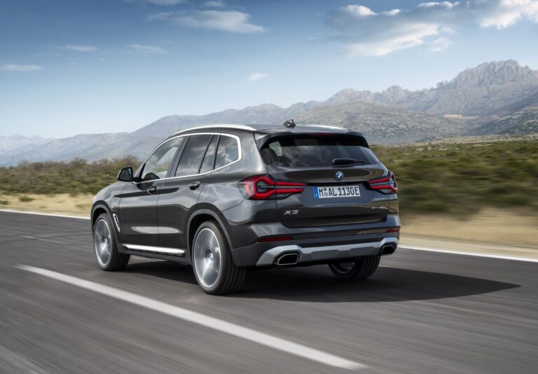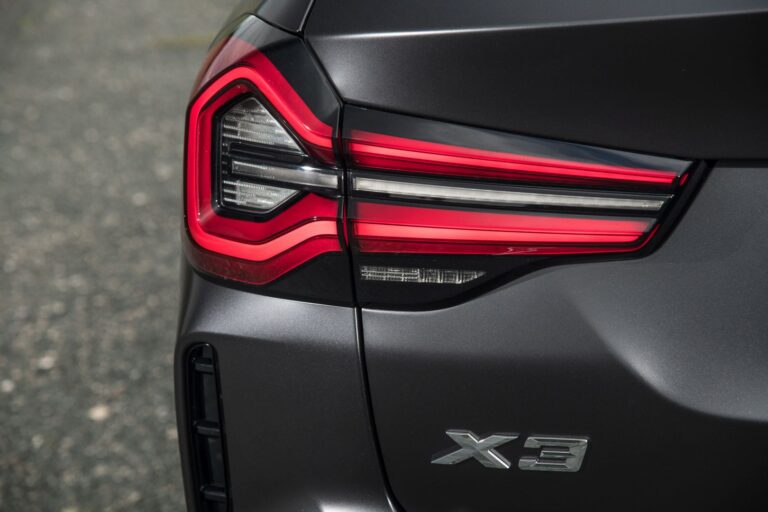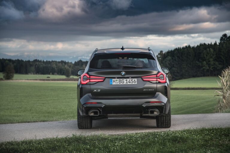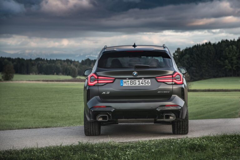 Poniżej reflektorów, pionowe wloty powietrza ułożone w trójkątny sposób otaczają przedni zderzak. W nowym przednim zderzaku, napięte i obszerne powierzchnie w kolorze nadwozia oraz solidna ochrona podwozia wzmacniają obecność i wysoką jakość SAV. BMW X3 xDrive30e z napędem hybrydowym plug-in nosi również emblemat „elektryfikowane przez i” na przednim błotniku, a dodatkowy niebieski pierścień zdobi wszystkie logotypy BMW w tej wersji silnikowej, w tym te na pokrywach piast kół. Tylna część nowego BMW X3 zyskuje na klarowności dzięki różnym działaniom. Czarna ramka nadaje pełnym tylnym światłom LED bardziej precyzyjny wygląd, natomiast węższa grafika świetlna teraz obejmuje trójwymiarowo modelowany kontur szczypiec oraz poziome kierunkowskazy zintegrowane w subtelny sposób. Nacisk na poziome linie, na przykład w wklęsłym obszarze na dolnej krawędzi tylnej klapy, przyczynia się do schludnego wrażenia tylnej części. Nowo zaprojektowana i starannie malowana ochrona podwozia daje mocne wrażenie na drodze. Nowe, osadzone płasko końcówki wydechu mają większe i sportowe kształty, co nadaje im potężną obecność.