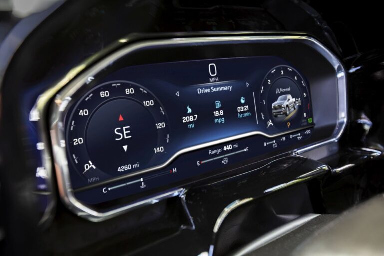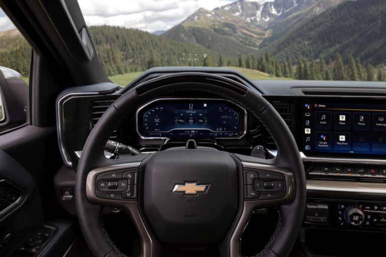 Nowe wnętrze skoncentrowane jest na kierowcy, z odważną 13,4-calową poziomą tablicą dotykową oraz 12,3-calowym cyfrowym, konfigurowalnym zestawem wskaźników. Co istotne, pionowe elementy tablicy rozdzielczej modelu z 2021 roku zostały zastąpione poziomymi liniami oraz unoszącymi się elementami, które zwiększają poczucie przestronności w kabinie Silverado.