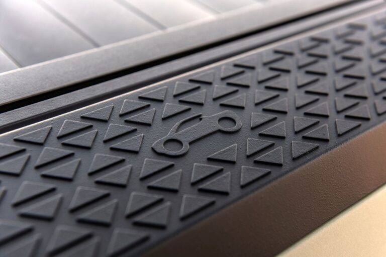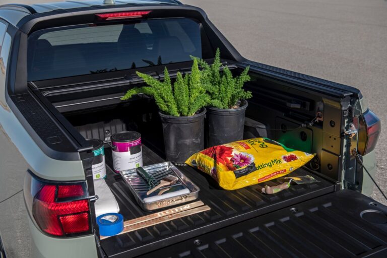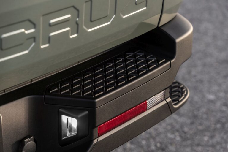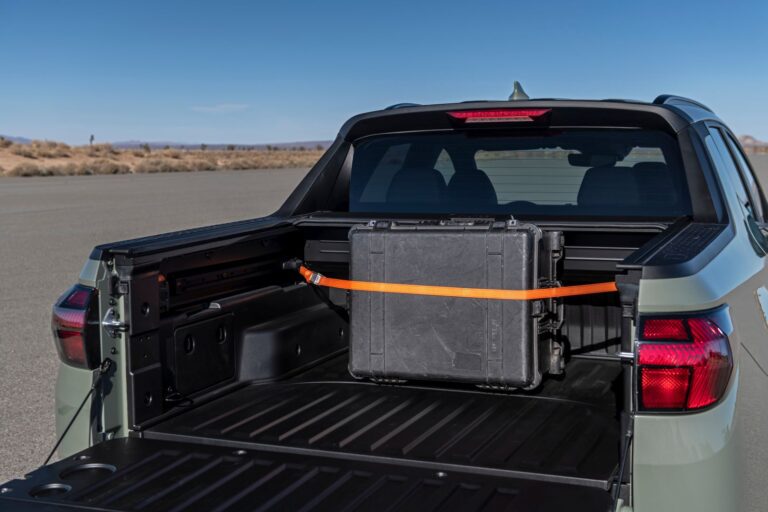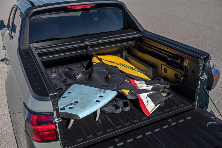 Z tyłu, pozioma sygnatura świetlna w kształcie „T” zwiększa wizualną szerokość i odróżnia Hyundai Santa Cruz od innych pojazdów na drodze. Funkcjonalny tylny otwarty bagażnik charakteryzuje się bezpiecznym, zamykanym schowkiem, zintegrowanymi krokami na zderzaku i zamykaną pokrywą, co harmonijnie wkomponowuje się w ogólny design. Tylne lampy są embosowane z napisem: „Zaprojektowane w Kalifornii”, jako dowód pasji zespołu projektowego Hyundai z Kalifornii. Małe, subtelne detale projektowe, takie jak te, można znaleźć w całym wnętrzu i na zewnątrz pojazdu.