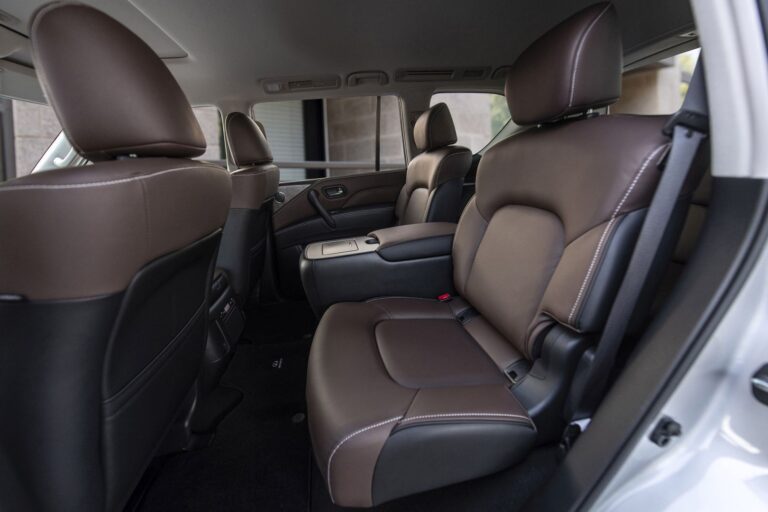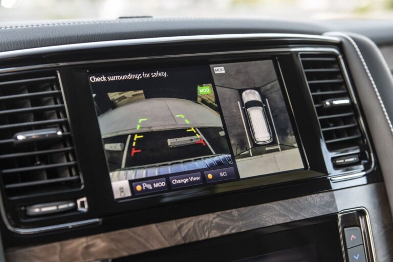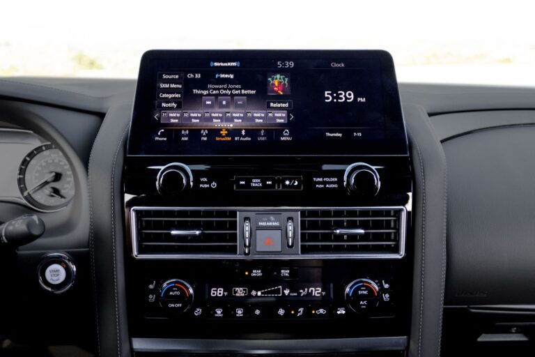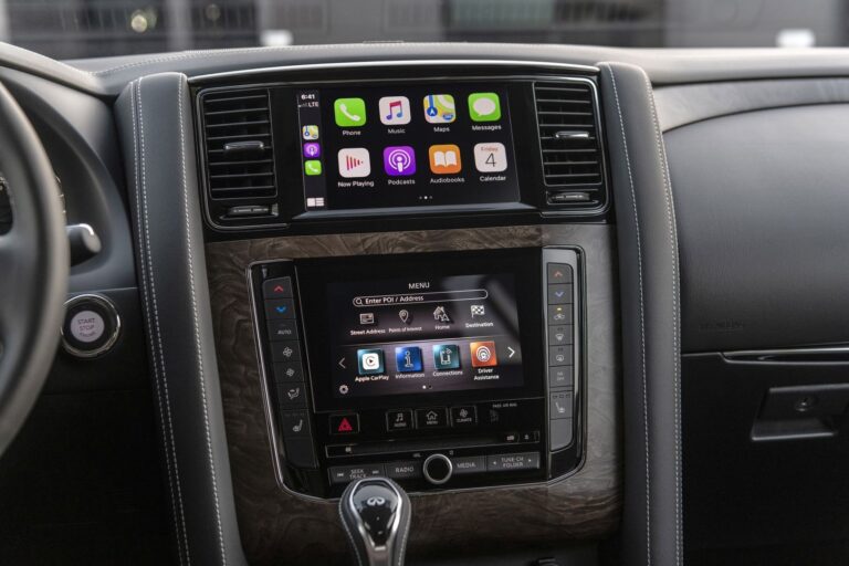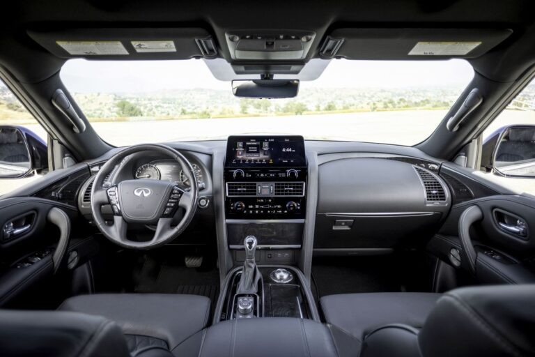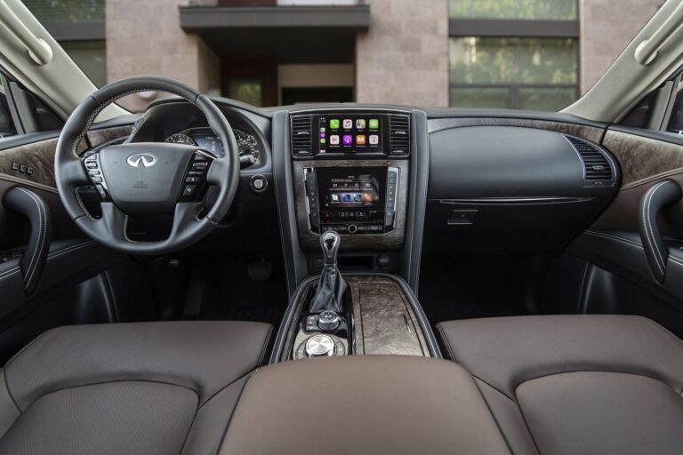 Wnętrze zyskało najważniejszą aktualizację, czyli system infotainment. Wygląda na to, że Infiniti wykorzystało ten sam system infotainment, co w Nissanie Primera P12, z ekranem i wieloma przyciskami umieszczonymi w dolnej części. Model 2022 QX80 powitał swoich klientów szerszym i wyższym ekranem dotykowym o przekątnej 12,3”, zamontowanym na górze centralnej konsoli, oferującym łączność z Apple CarPlay i Android Auto.