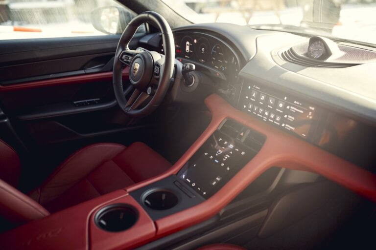 Bardzo cenione kontury designu znane z Taycana również znajdują się wewnątrz nowej wersji: skrzydłowe górne i dolne sekcje deski rozdzielczej rozciągają się na całą szerokość pojazdu. Wolnostojący, zakrzywiony zestaw wskaźników stanowi najwyższy punkt na desce. Centralny wyświetlacz infotainment o przekątnej 10,9 cala oraz dodatkowy, opcjonalny wyświetlacz dla pasażera z przodu tworzą zintegrowany szklany pas w stylu ciemnej paneli.