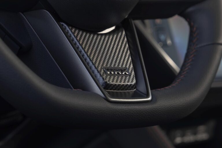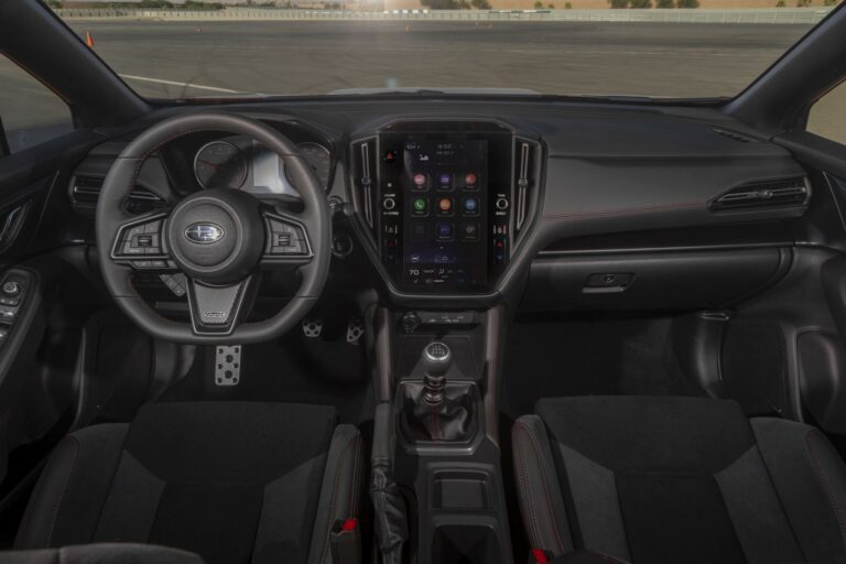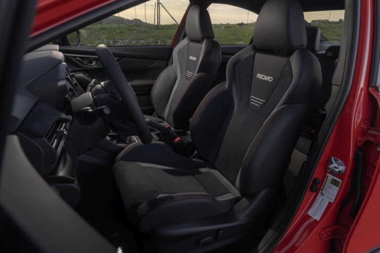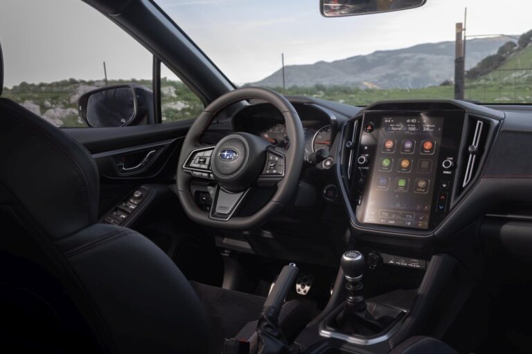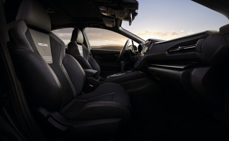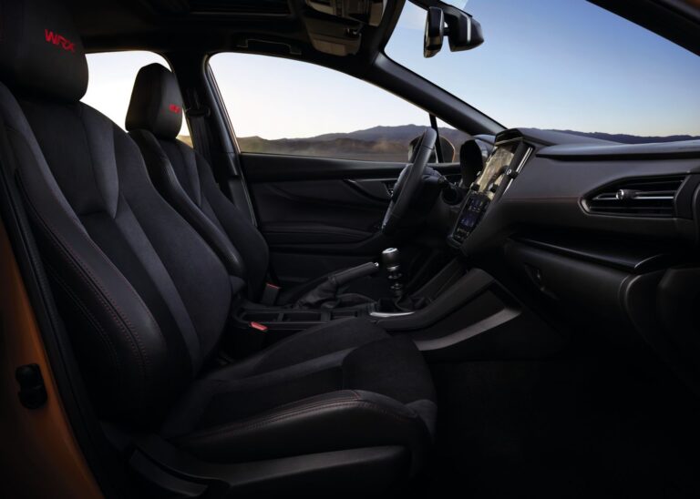 Czarne wnętrze z kontrastującymi czerwonymi przeszyciami oraz akcentami w wzorze włókna węglowego podkreślają możliwości wydajnościowe pojazdu. Uczucie wysokiej wydajności staje się silniejsze, gdy kierowca wchodzi do WRX 2022 i chwyta za kierownicę z płaskim dnem i skórzanym pokryciem, zintegrowanymi przyciskami do sterowania audio, rozpoznawania głosu i kontroli EyeSight. Automatyczne okna z funkcją podnoszenia/opuszczania po obu stronach kierowcy i pasażera; tylna kanapa dzielona w proporcji 60/40; elektryczne zamki drzwi i lusterka boczne to standard.