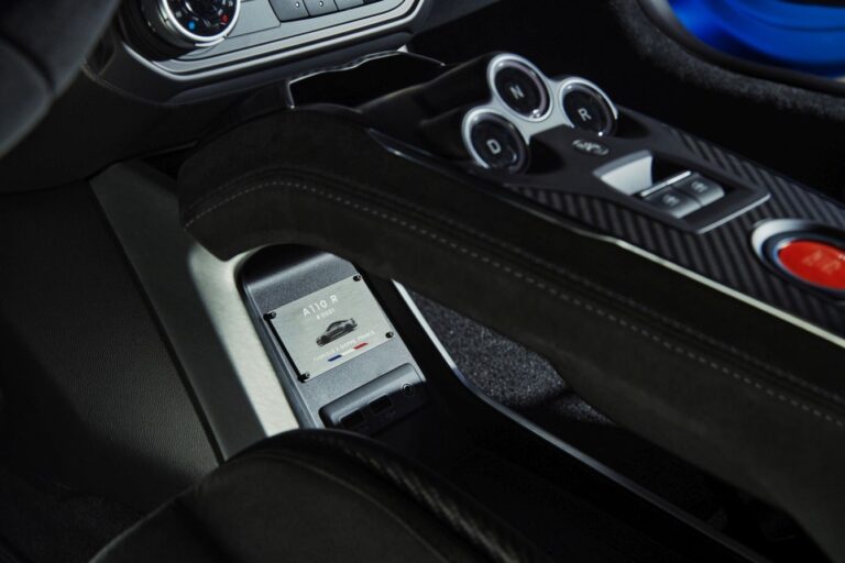 Wnętrze Alpine A110 R wykonane jest w całości z mikrofibry – nawet wykończenie paneli drzwiowych! Zamiast tradycyjnych uchwytów drzwiowych użyto czerwonych pasków, co stanowi nawiązanie do świata sportów motorowych. Kierownica również jest pokryta mikrofibrą z szarym szyciem. Inteligentne połączenie estetyki, autentyczności i efektywnego designu sprawia, że wnętrze jest naprawdę sportowe.