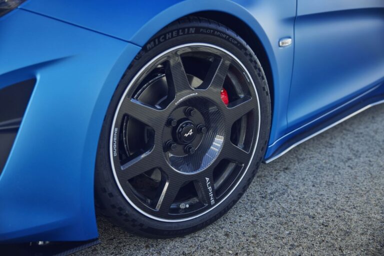 Opracowane przez zespół Alpine wspólnie z dostawcą, Duqueine, unikalne, dostosowane koła całkowicie nowego Alpine A110 R również są wykonane w całości z włókna węglowego i zaprojektowane z myślą o trzech celach: poprawić osiągi samochodu poprzez redukcję wagi; optymalizować aerodynamikę; oraz zapewnić lepsze chłodzenie hamulców. W związku z tym koła ważą 12.5 kg mniej niż w A110 S. Bardziej otwarte z przodu i bardziej zamknięte z tyłu, koła mają unikalny design z wyważoną wydajnością dynamiczną, zoptymalizowanym oporem i lepszym chłodzeniem hamulców.