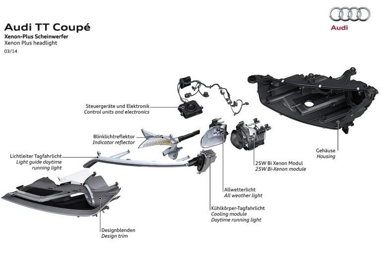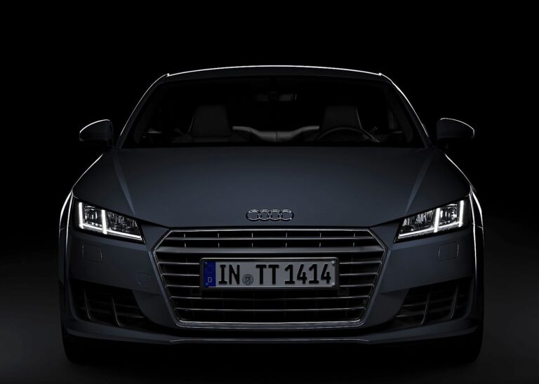 Płaskie reflektory nadają twarzy nowego TT zdecydowany wygląd. Jednostki Xenon plus są standardowe, a Audi może opcjonalnie dostarczyć reflektory LED lub te w nowatorskiej technologii Audi Matrix LED, gdzie światło drogowe generowane jest przez sterowane indywidualnie diody LED. W obu wersjach reflektory mają niepowtarzalny kontur stworzony przez szczelinę w reflektorach, która jest podświetlana przez prowadnice świetlne.
