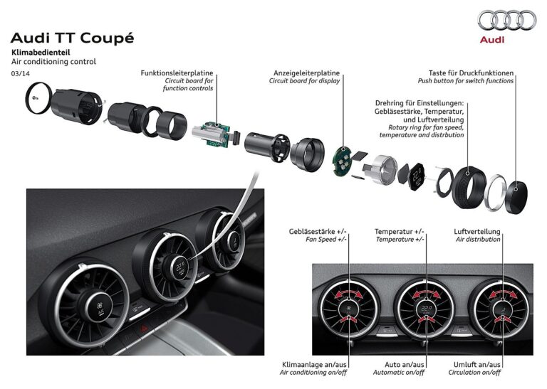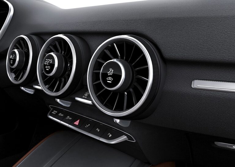 Z góry, deska rozdzielcza przypomina skrzydło samolotu; okrągłe wentylacje powietrza – klasyczna cecha TT – przypominają silniki odrzutowe swoim turbinowym designem. Wentylacje zawierają również wszystkie sterowania dla standardowego systemu klimatyzacji i opcjonalnego automatycznego systemu klimatyzacji (standard w TTS). Sterowania dla ogrzewania siedzeń, temperatury, kierunku, rozkładu powietrza i siły przepływu powietrza znajdują się na ich środku; wybrane ustawienie jest wyświetlane na małych wyświetlaczach w automatycznym systemie klimatyzacyjnym. Poziomy panel sterujący znajduje się pod centralnymi wentylacjami powietrza. Przełączniki zaprojektowane w technologii 3D aktywują światła awaryjne, Audi drive select i funkcje wspomagające.
