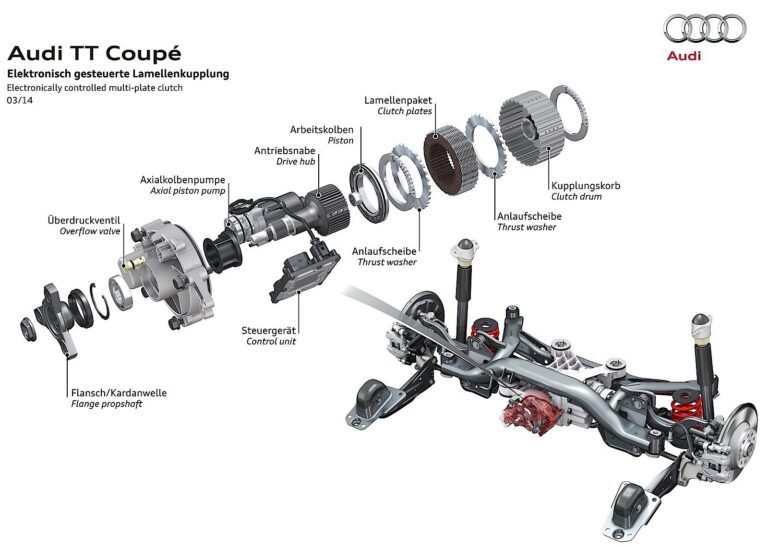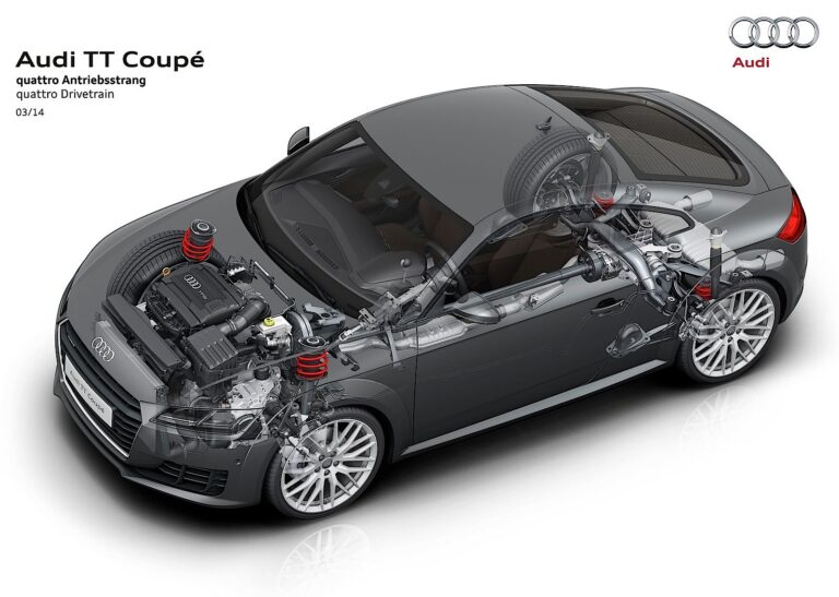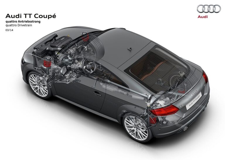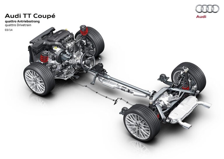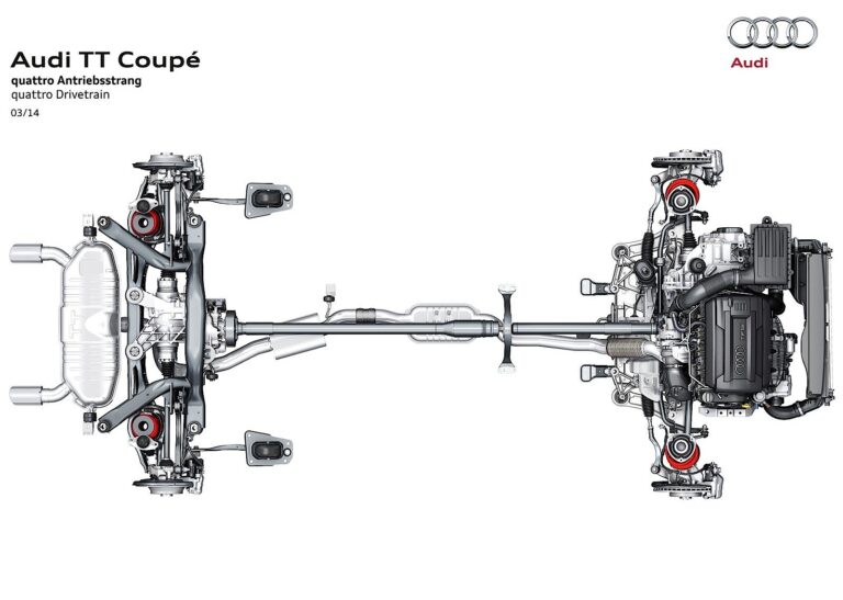 W nowym Audi TT, stały napęd na cztery koła quattro zapewnia dodatkową stabilność, przyczepność i przyjemność z jazdy. Został on systematycznie rozwinięty i zoptymalizowany specjalnie dla nowego TT. Jego elektrohydraulicznie sterowane sprzęgło wielopłytkowe montowane jest na tylnej osi. Specjalna konstrukcja pompy zmniejsza wagę o około 1.5 kg w porównaniu do poprzedniego modelu. Rozdział momentu napędowego między osiami jest kontrolowany elektronicznie w ułamkach sekundy.