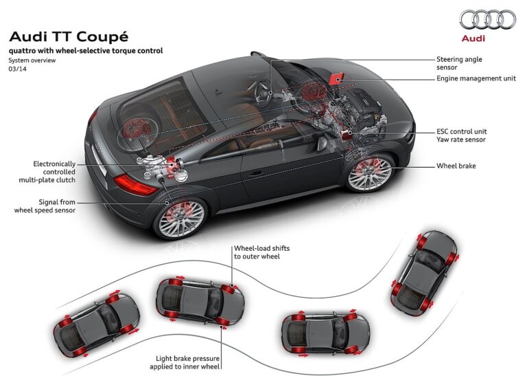 Elektroniczna kontrola stabilności (ESC), która może być częściowo lub całkowicie wyłączona, doskonale uzupełnia sportowe prowadzenie samochodu. Podczas jazdy przez zakręty aktywuje się wektoryzacja momentu. Jeśli zajdzie taka potrzeba, moment napędowy jest rozdzielany z wewnętrznego przedniego koła do zewnętrznego przedniego koła (napęd na przednie koła) lub, w modelach quattro, również do tylnych kół. Dzięki różnicy w siłach napędowych, samochód łatwo wchodzi w zakręt, co jest pomocne dla kierowcy. W ten sposób zakręty można pokonywać z dużą precyzją i neutralnie. To znacząco zwiększa dynamikę i stabilność TT. Tryb sportowy wspomaga szczególnie sportową jazdę, ułatwiając kierowanie i kontrolowanie podczas driftu.