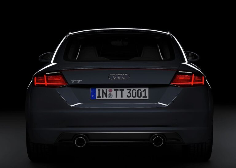 Szczególnie z tyłu, poziome linie podkreślają wrażenie sportowej szerokości nowego TT. Wraz z reflektorami LED i Audi Matrix LED, tylne światła również mają dynamiczne kierunkowskazy. Kolejny parallela do przednich reflektorów: pasek w tylkach, który również tworzy kontur świateł dziennych – kolejna innowacja Audi. Trzecie światło stopu to niezwykle wąski pasek umiejscowiony pod krawędzią tylnego spojlera. Odtwarza kluczową rolę w definiowaniu sylwetki świateł tylnych.