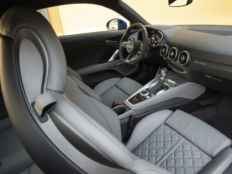 Wyposażenie nowego Audi TTS obejmuje rozszerzone elementy wnętrza, które dodają indywidualnie wybierane akcenty kolorystyczne do klamr siedzeń sportowych S, boków konsoli centralnej i pierścieni wentylacji powietrza. Klienci z wyrafinowanym gustem mają wiele opcji dostosowania. Dostępne są tapicerki w różnych tkaninach i klasach skórzanych dla siedzeń, a także trzy pakiety skórzane. Fotele sportowe S mają charakterystyczne diamentowe pikowanie w środkowej sekcji.