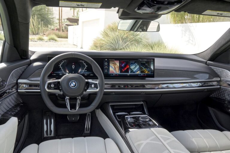 Kokpit nowej serii 7 BMW ma znacznie mniej przycisków, przełączników i elementów sterujących niż jego poprzednik. Kluczowym elementem jest zaangażowanie w cyfryzację, które wyraża zakrzywiony wyświetlacz BMW. Ta w pełni cyfrowa grupa ekranów składa się z 12,3-calowego wyświetlacza informacyjnego za kierownicą oraz wyświetlacza sterującego o przekątnej 14,9 cala. Kierownica i wybierak biegów w konsoli centralnej również mają nowy design. Tu zadebiutuje też pasek interakcji BMW jako nowy typ elementu sterowania i wzornictwa. Ta funkcjonalna jednostka, która ma skuteczne podświetlenie, rozciąga się na całą szerokość deski rozdzielczej oraz w głąb wykończenia paneli drzwiowych.