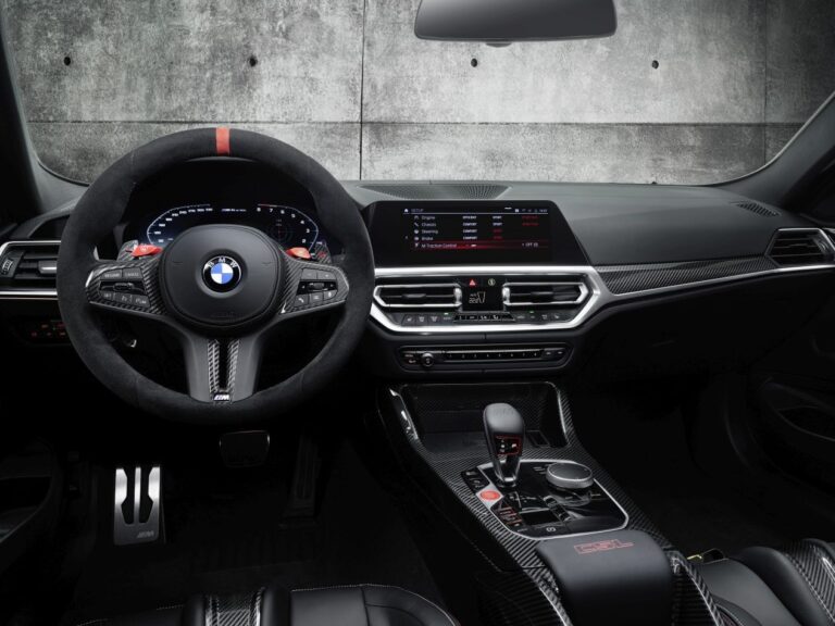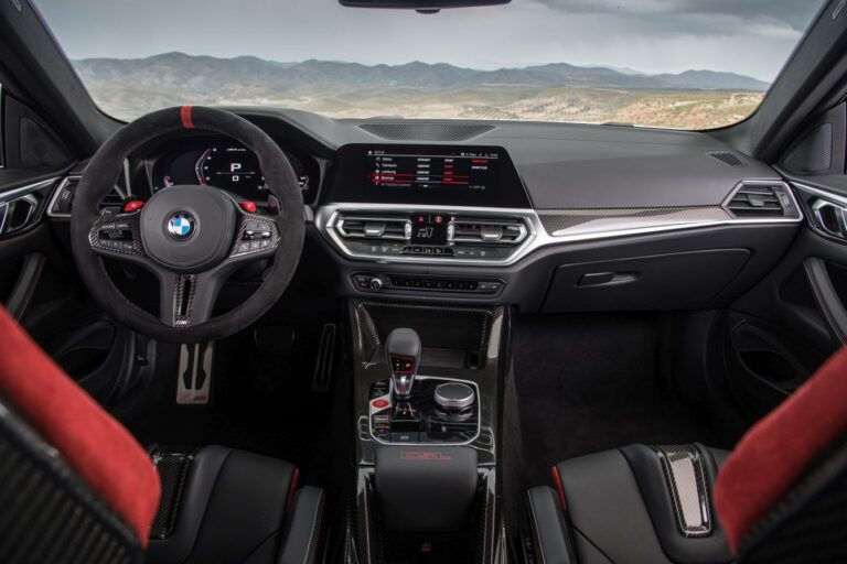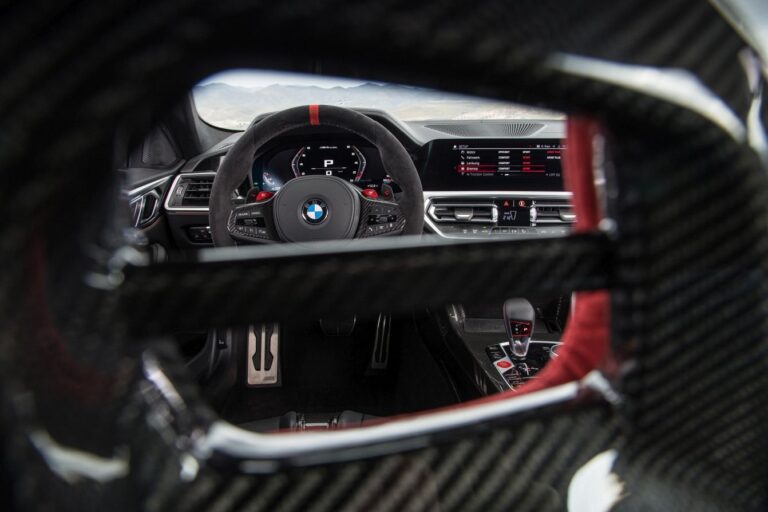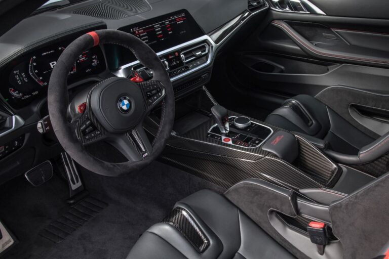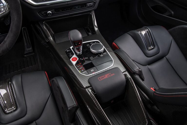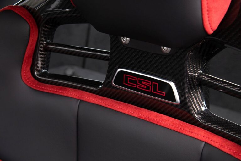 Cechy wyposażenia specyficzne dla modelu nadają BMW M4 CSL wyjątkowy balans między purystycznym charakterem sportowego samochodu, nieograniczoną codzienną użytecznością oraz ekskluzywnymi materiałami premium. Fotele M Carbon o pełnym kształcie dla kierowcy i pasażera wyróżniają się samonośną strukturą CFRP oraz celowym odrzuceniem cech poprawiających komfort. Posiadają stały kąt oparcia, a regulacje przodu/tyłu można dokonywać ręcznie, natomiast wysokość siedzenia można dostosować tylko w warsztacie za pomocą trzystopniowego mechanizmu śrubowego. Fotele M Carbon mają również odpinane zagłówki i pozwalają na integrację systemu sześciopunktowych pasów.