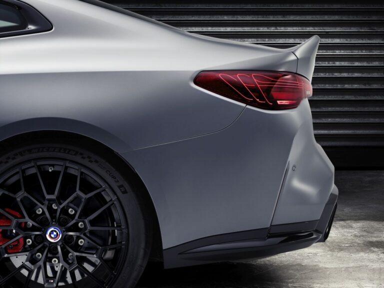 Tylne światła LED nowego BMW M4 CSL są standardowo wyposażone w technologię, która debiutuje w seryjnie produkowanym samochodzie. Ich szklane osłony mają misternie wplecione włókna świetlne, które są podświetlane za pomocą technologii laserowej, nadając powierzchniom świateł żywą strukturę. Tworzy to wysoce charakterystyczny podpis świetlny, który jest rozpoznawalny z daleka podczas ciemności.