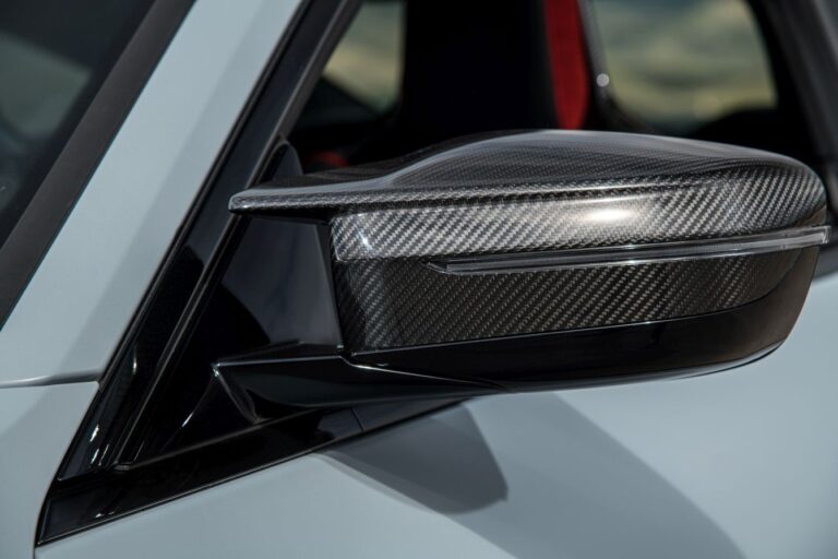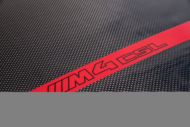 Struktura z włókna węglowego elementów nadwozia jest widoczna w różnych miejscach, w tym w dwóch wyraźnych wklęsłości w masce. Powierzchnie tych wklęsłości – nie malowane w kolorze nadwozia – są podkreślone czerwonymi konturami. Czerwone linie akcentujące dodatkowo akcentują dwa występy na dachu CFRP nowego BMW M4 CSL, kontury progów bocznych, czarne oznaczenia modelu oraz specyficzne dla modelu CFRP spojlery i wloty powietrza na przednim zderzaku.